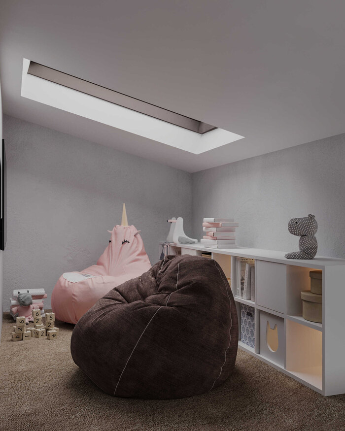 Основная задача этой комнаты — создать пространство, где можно и отдыхать, и играть, и фантазировать.