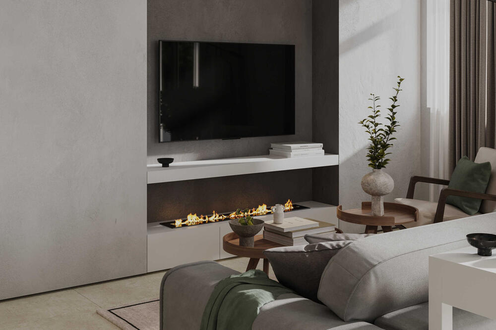 Отделка выполнена в нейтральной палитре: светлые стены с декоративной штукатуркой, тёплый оттенок напольного покрытия и текстильные акценты. Такое сочетание создаёт спокойный фон и легко адаптируется под разные сценарии использования — от отдыха днём до вечернего освещения с мягкими световыми акцентами.