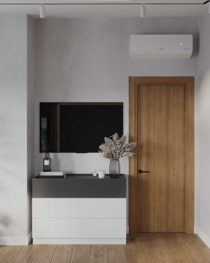Отделка выполнена в светлой, нейтральной палитре с практичными материалами, устойчивыми к повседневной эксплуатации. Напольное покрытие легко очищается, а стены с декоративной штукатуркой сохраняют аккуратный вид даже при активном использовании.