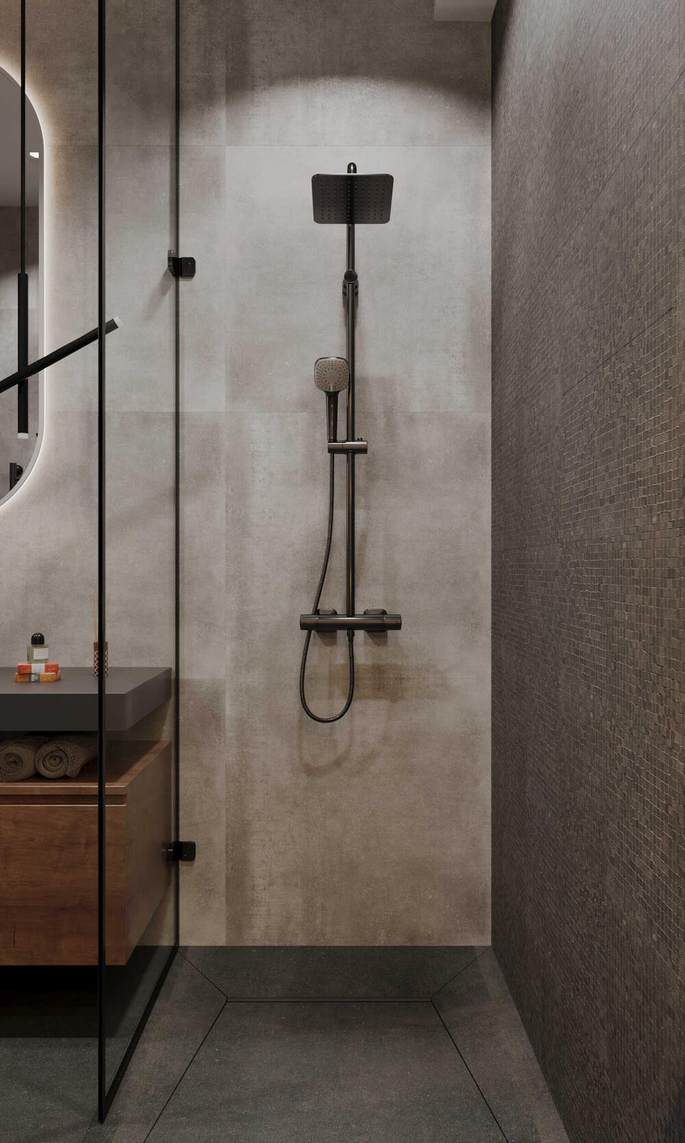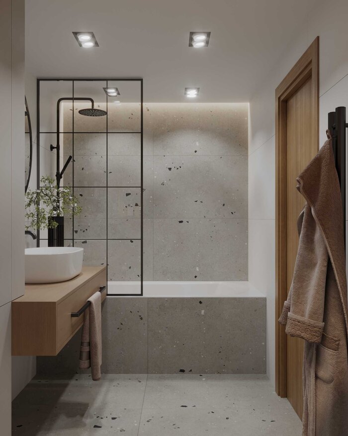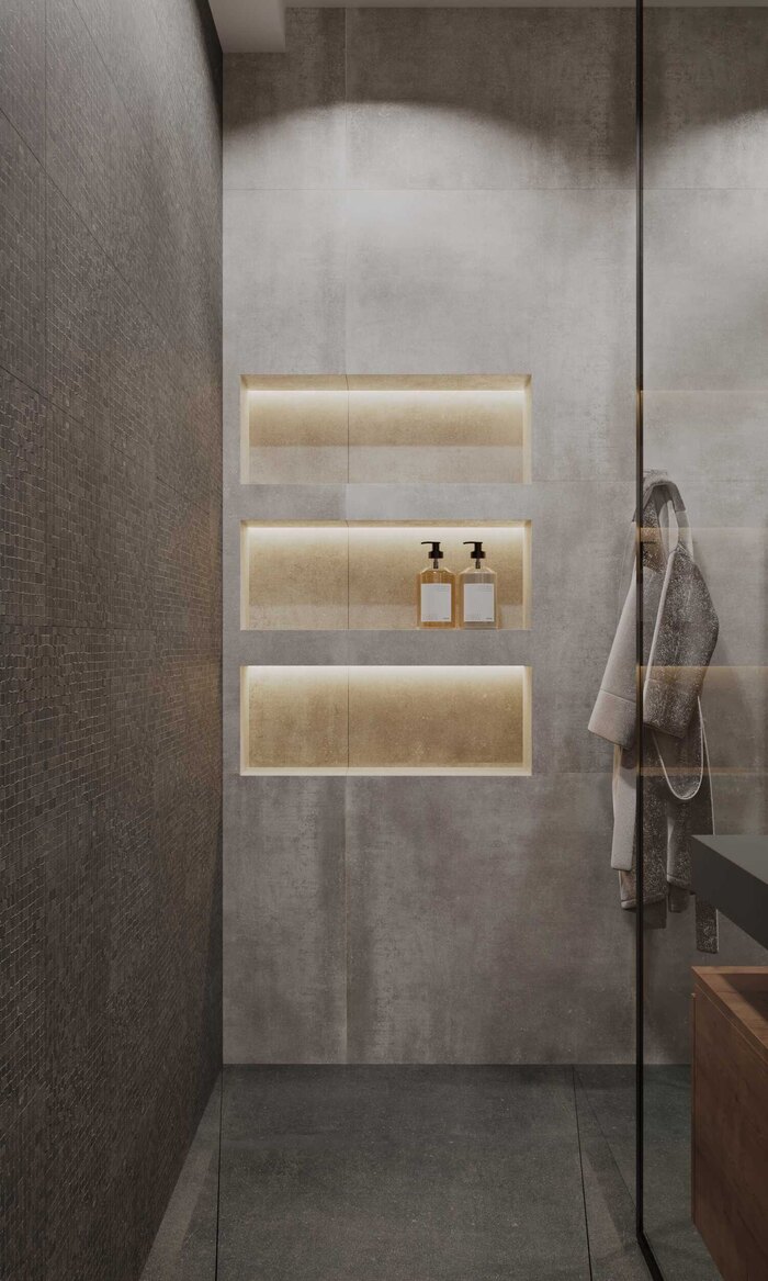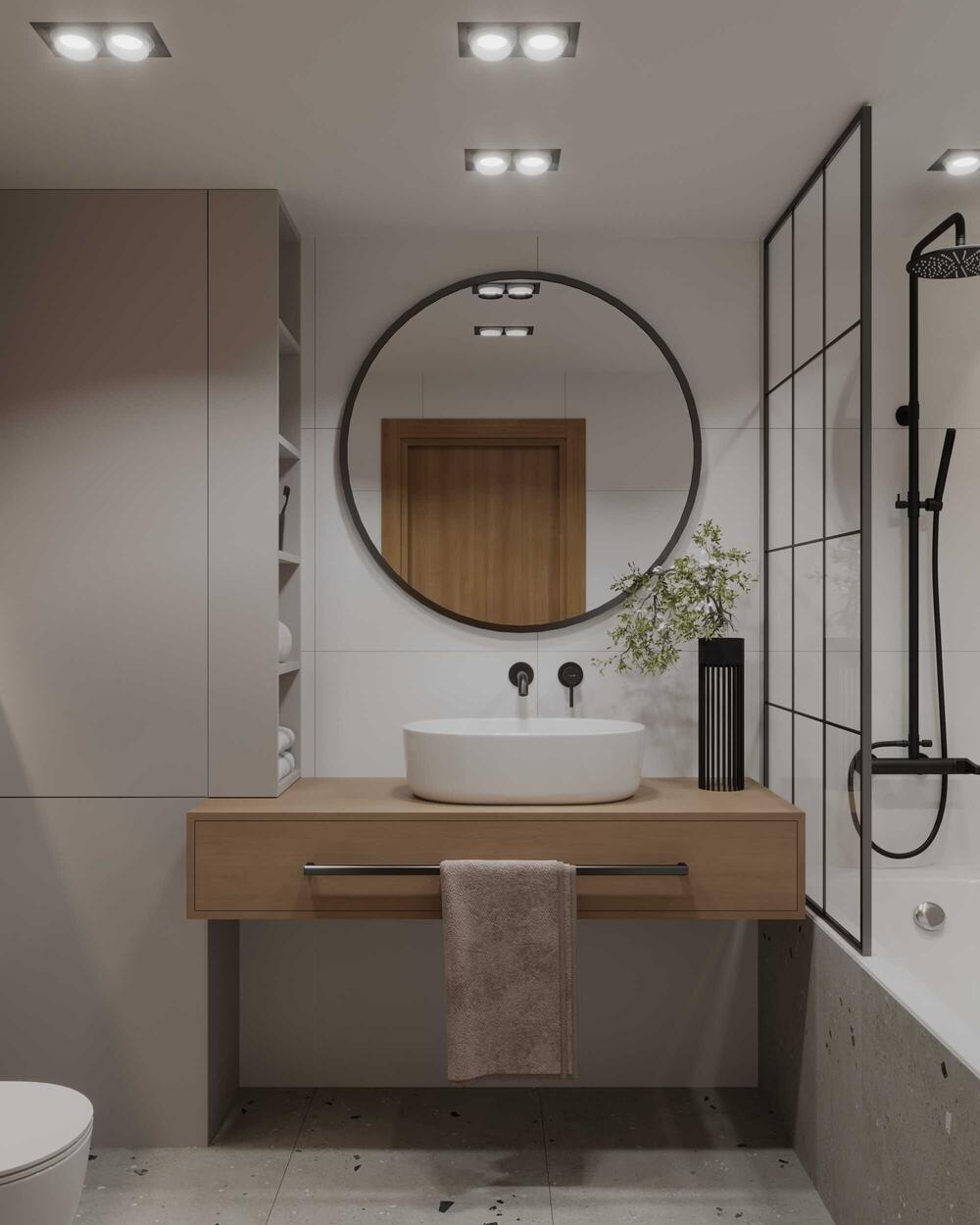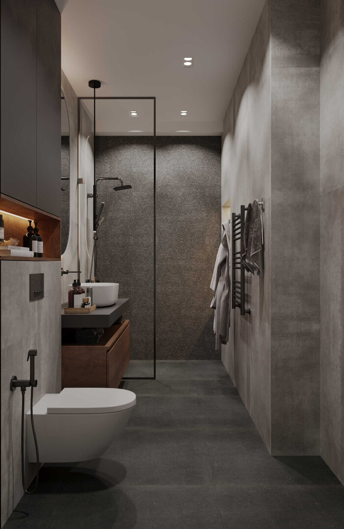 В отделке использовали керамогранит в нейтральной гамме — практичное решение, устойчивое к влаге и простое в уходе. Подвесная сантехника и встроенная мебель визуально облегчают интерьер, а системы хранения позволяют аккуратно разместить всё необходимое для повседневного использования.