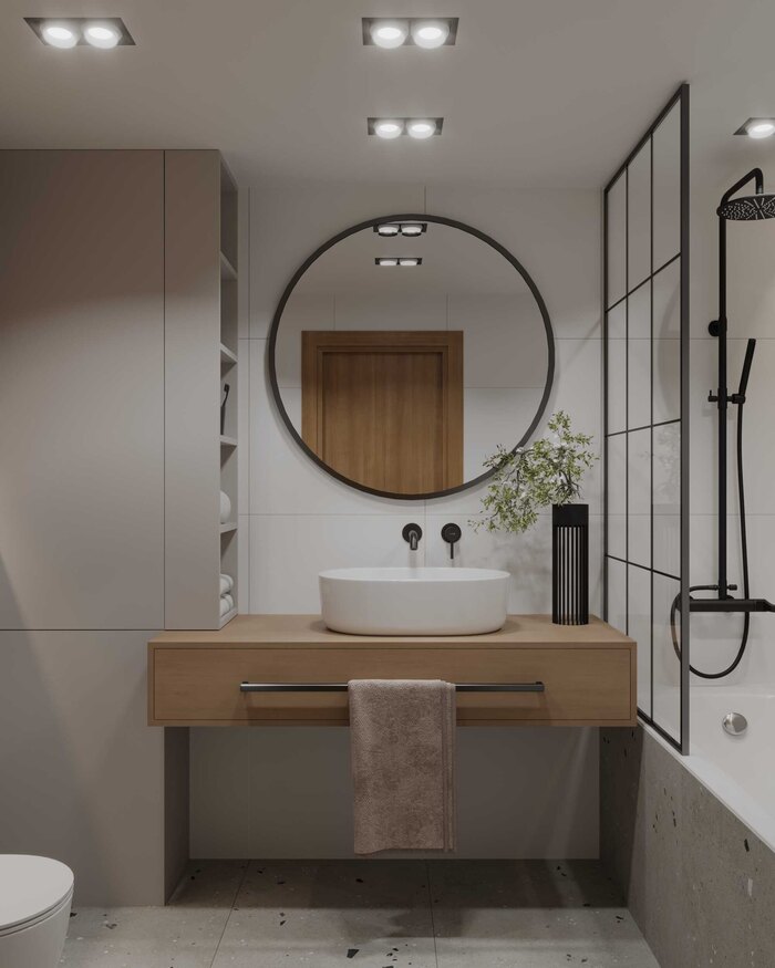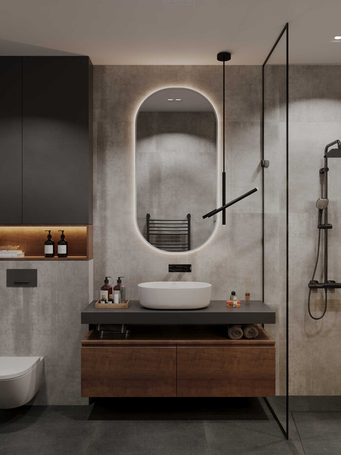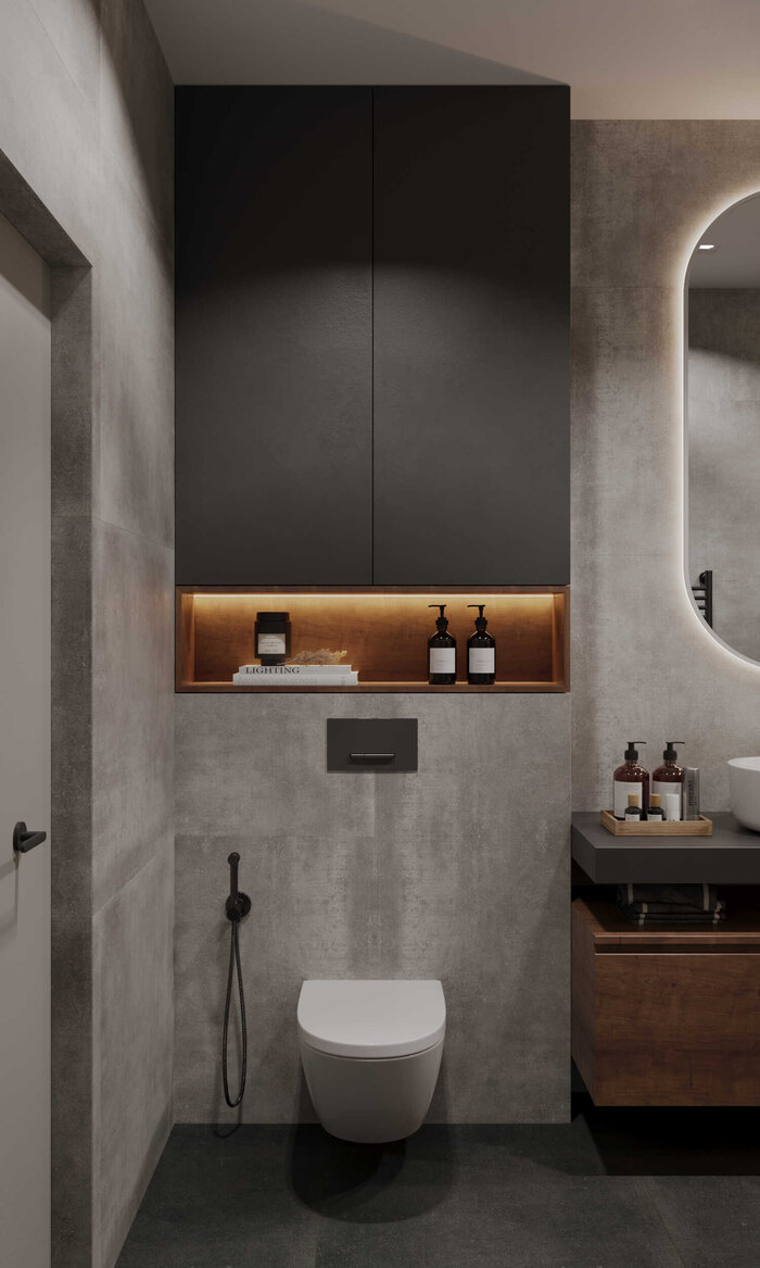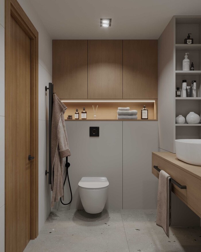 Подвесная сантехника и лаконичная мебель визуально облегчают пространство, а встроенные системы хранения позволяют убрать всё лишнее из поля зрения. Освещение продумано так, чтобы санузел оставался светлым и аккуратным в любое время суток.