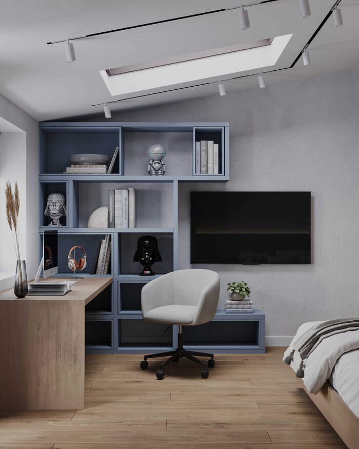 Мы предусмотрели стеллаж для коллекции масок Дарт Вейдера — он стал смысловым акцентом комнаты и отражением личности хозяйки. Планировка остаётся функциональной: удобное спальное место, рабочая зона и хранение.