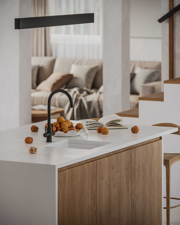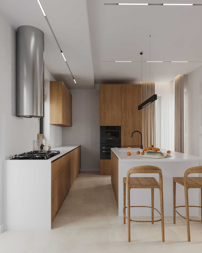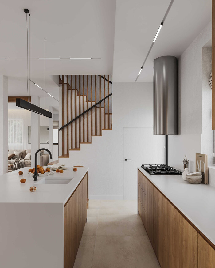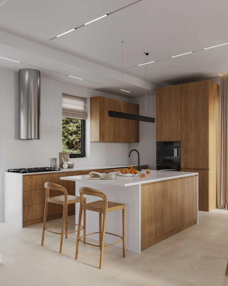 Основная задача кухни — быть удобной для повседневной жизни семьи и при этом не спорить с общим пространством дома.