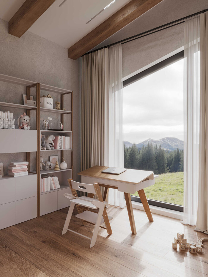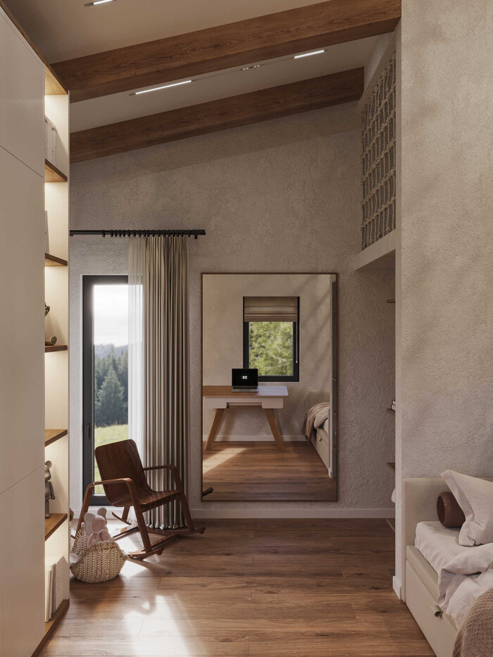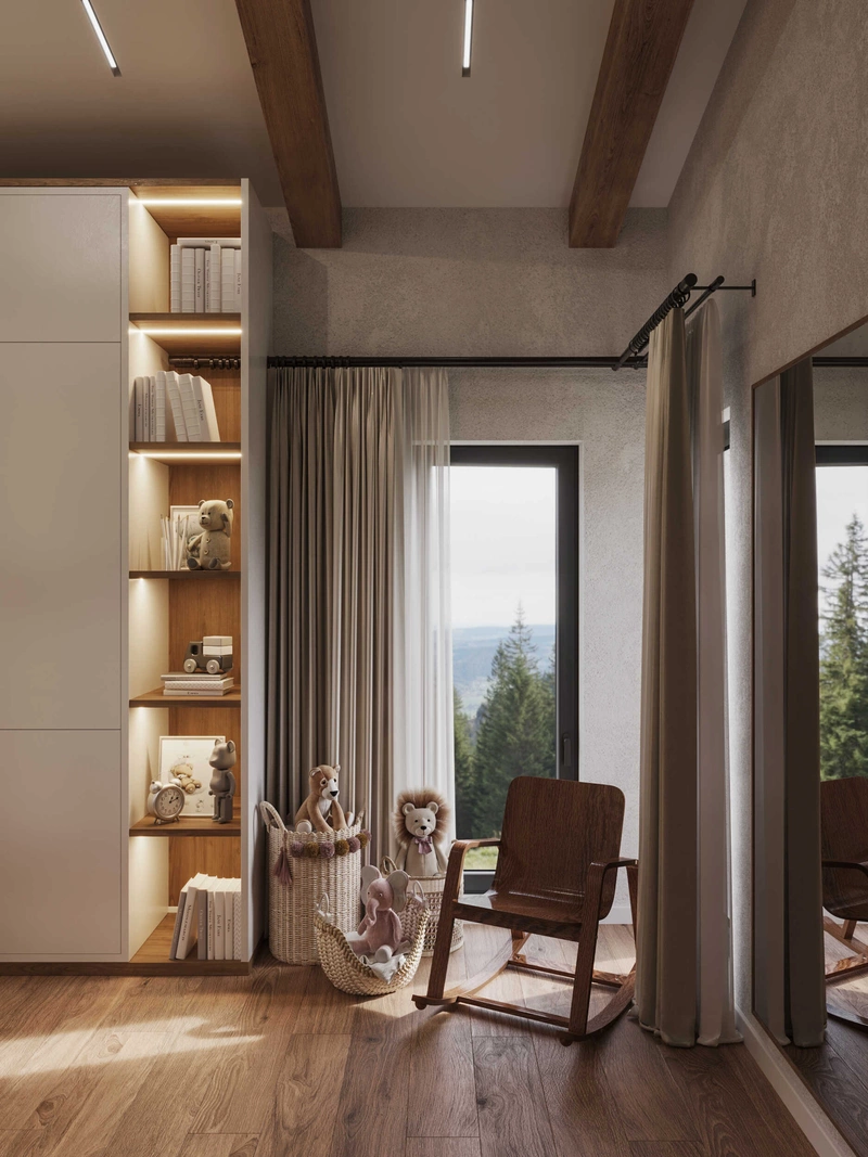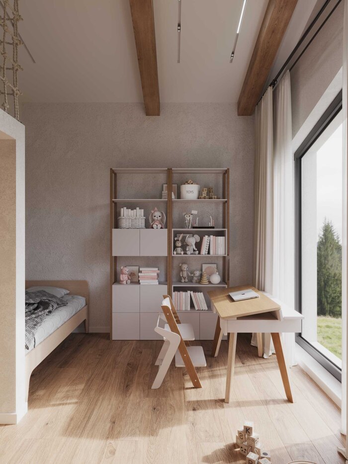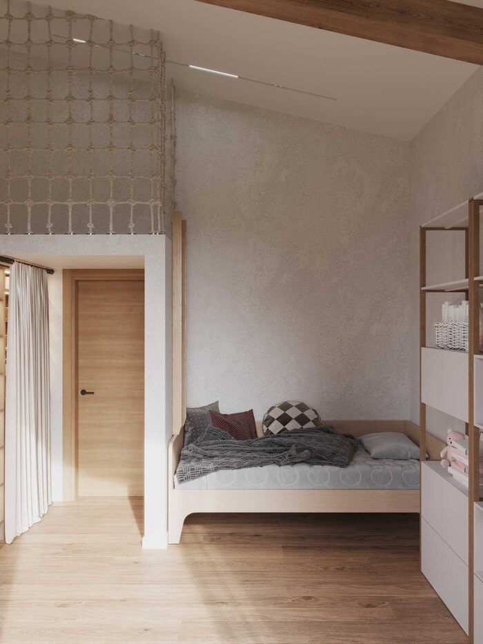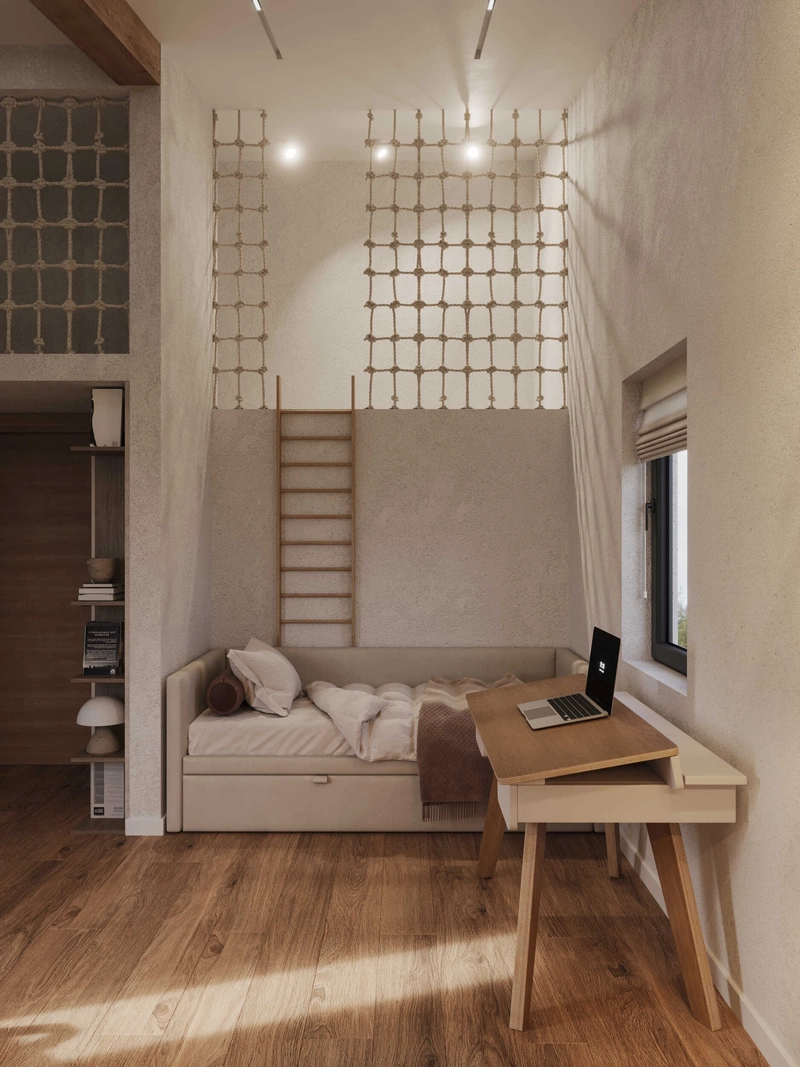 Сюда ведёт удобная лестница, а безопасность обеспечивают сетки и ограждения. Здесь можно играть, лазать, читать и просто проводить время вместе. Такое решение позволило не загромождать сами детские и вынести активные сценарии в отдельную зону.