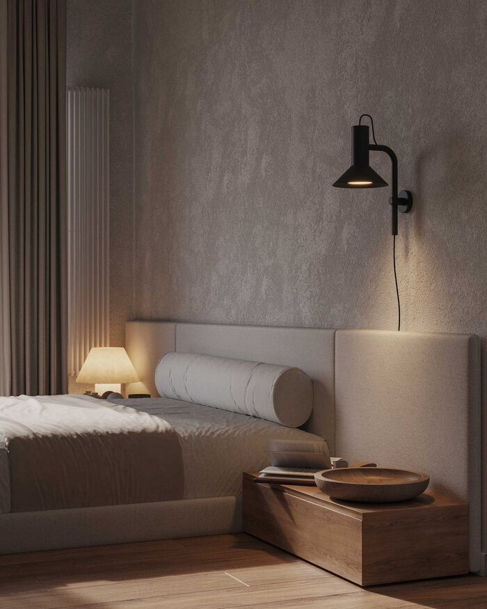 Освещение продумано по сценариям: есть мягкий свет для вечера, локальное освещение у кровати и общее — для повседневных задач. Благодаря этому спальня легко подстраивается под разные ритмы дня.