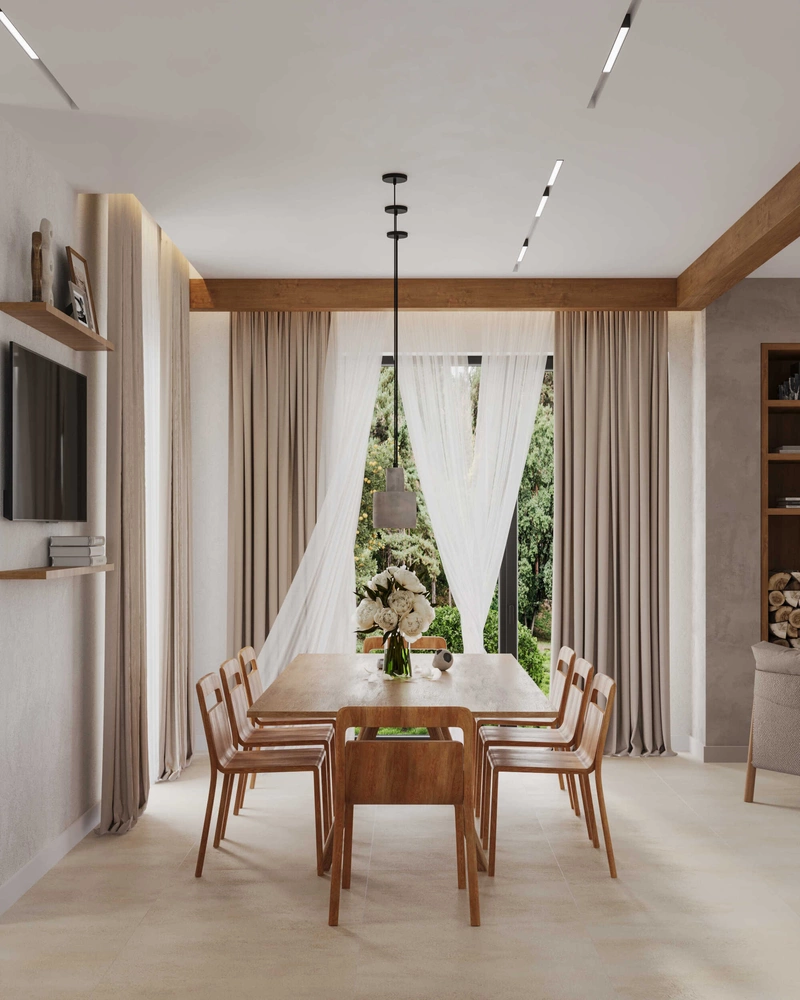 Дерево — использовано в мебели, потолочных балках и элементах отделки. Добавляет пространству тепло, подчёркивает природный характер интерьера и делает его более живым.
