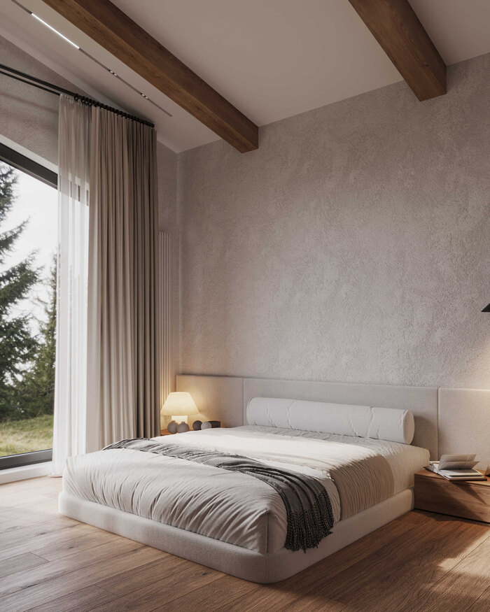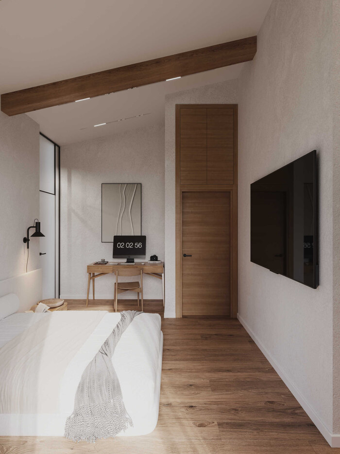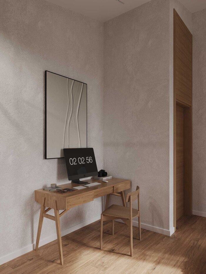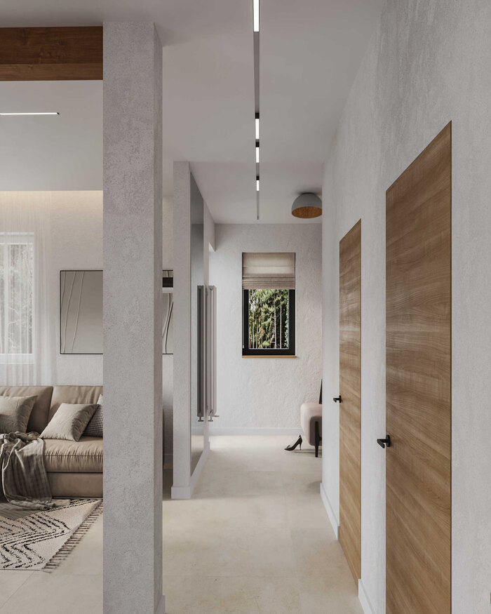 Интерьер выполнен в стиле минимализм с джапанди-акцентами, с использованием натуральных материалов и спокойной палитры. Все зоны хранения вынесены в отдельные гардеробные и постирочную, благодаря чему жилые помещения остаются свободными и лёгкими по восприятию.