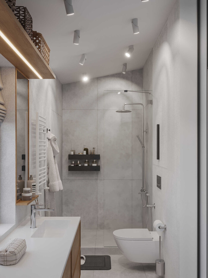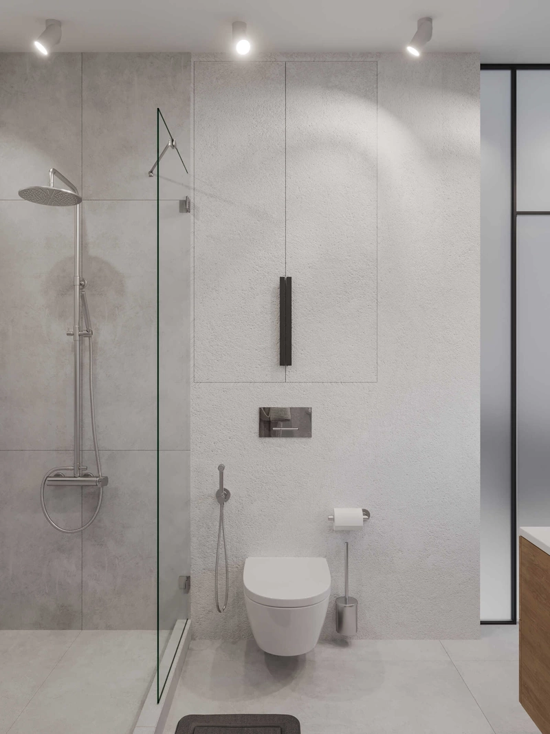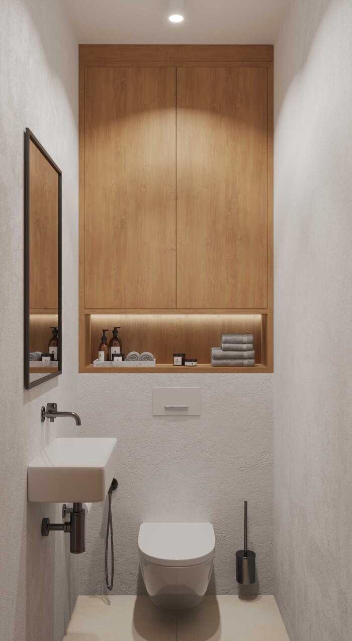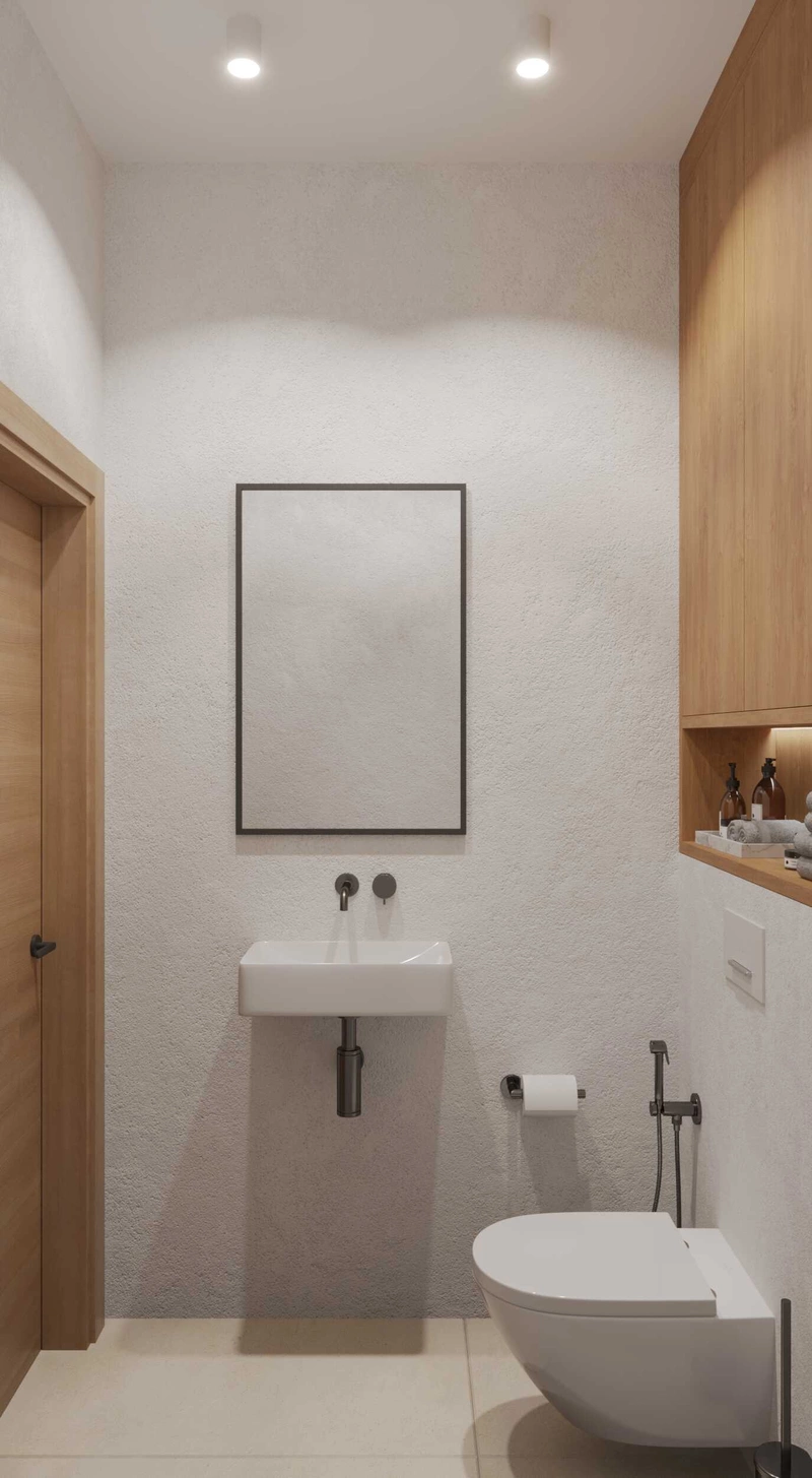Подвесная сантехника и лаконичная раковина визуально облегчают пространство и упрощают уборку. Встроенные ниши и шкафчик позволяют хранить нужные мелочи, сохраняя аккуратный вид. Санузел получился практичным, нейтральным и легко вписывается в общий стиль дома.