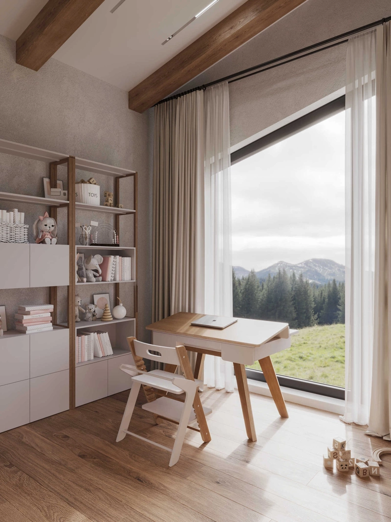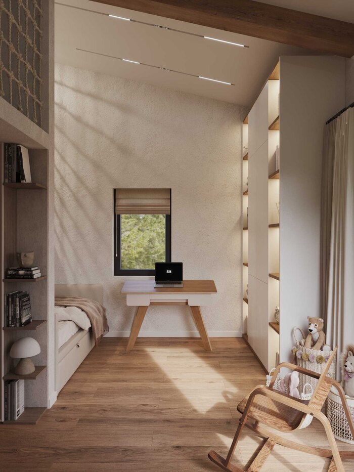 Кровать разместили так, чтобы вокруг неё оставалось место для движения и игр на полу. Рабочий стол поставили у окна — здесь удобно рисовать, собирать конструкторы и заниматься творчеством при естественном свете. Хранение организовали на доступной высоте: книги, игрушки и материалы ребёнок может сам достать и убрать.