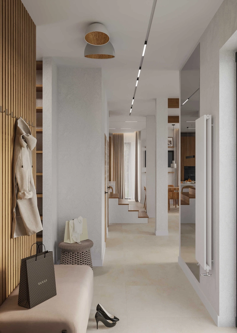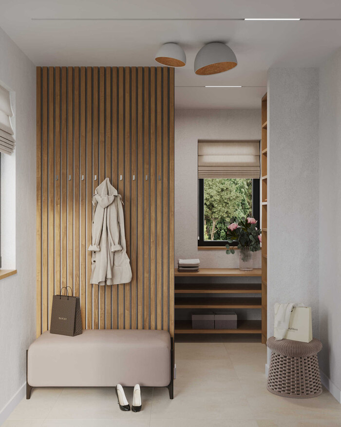 Прихожую спроектировали как полноценную зону хранения, а не просто проходное пространство. Здесь сразу предусмотрели удобную гардеробную: для верхней одежды, обуви и сезонных вещей.
