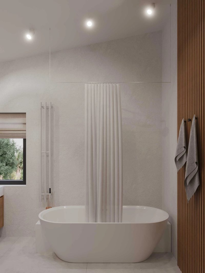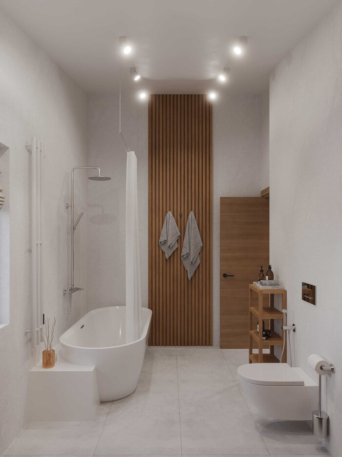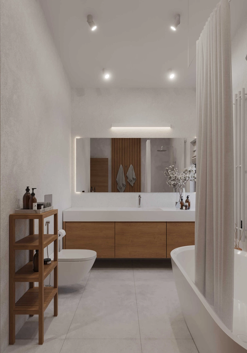 Ванную сделали светлой и спокойной, с акцентом на комфорт и удобство в повседневной жизни. Отдельно стоящая ванна стала центральным элементом пространства — здесь удобно и быстро принять душ, и расслабиться вечером.