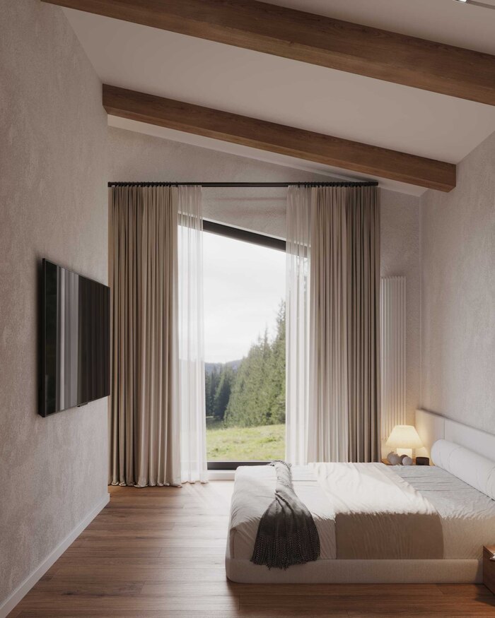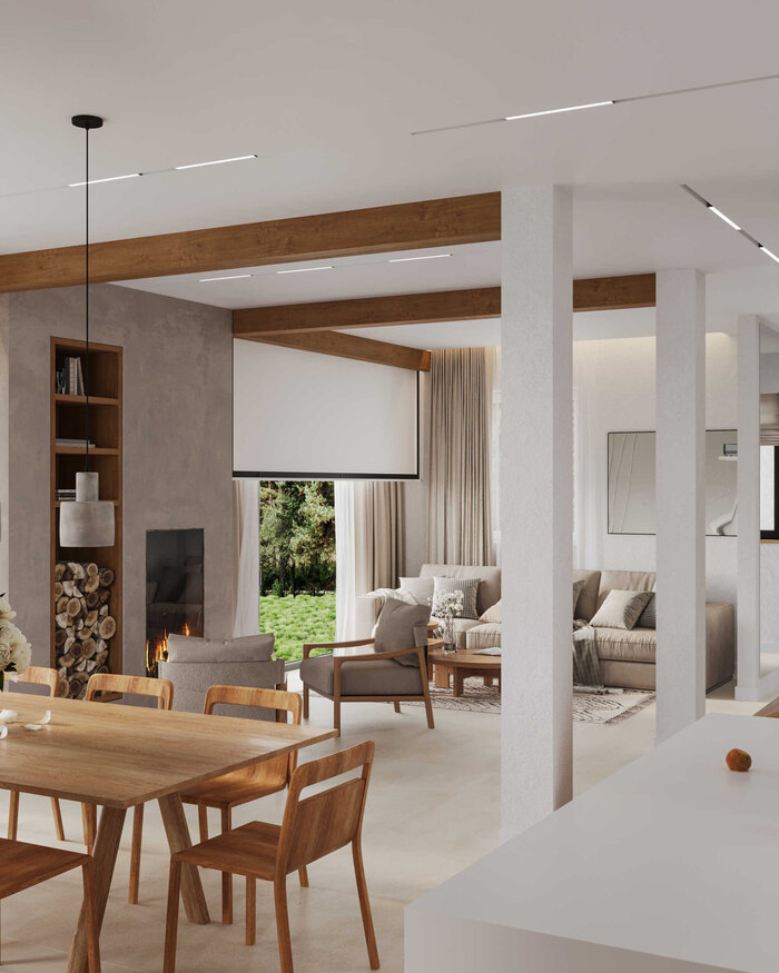 Используются не только как стилистический приём, но и как функциональный элемент. Балки помогают скрыть технические решения — например, экран проектора или карнизы для штор — и при этом задают интерьеру характер и ритм.