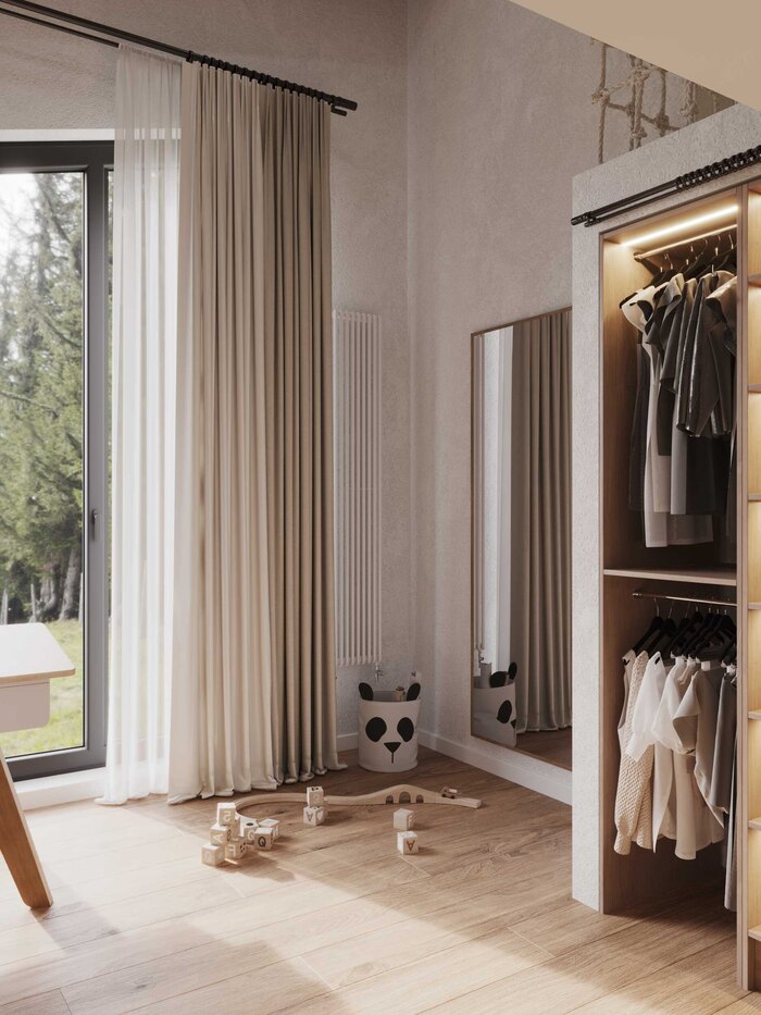 Комната девочки двух лет спроектирована с акцентом на безопасность и простоту. Здесь всё на своём месте и ничего лишнего. Кровать расположена так, чтобы ребёнку было удобно и безопасно спать, а родителям — подходить со всех сторон. Игровая зона остаётся свободной, без острых углов и сложных конструкций. Все предметы хранения находятся низко — игрушки легко доставать.