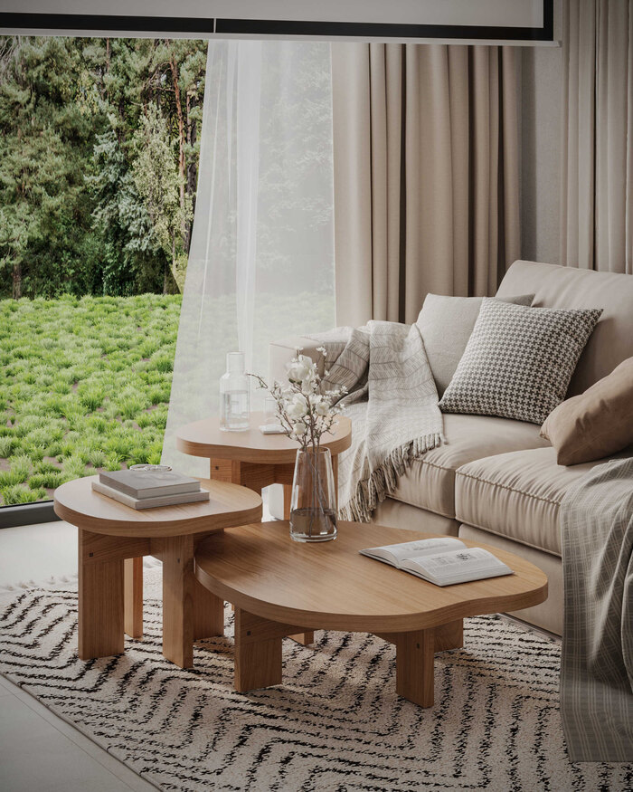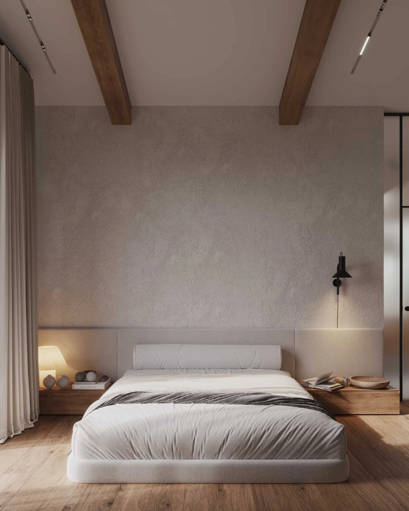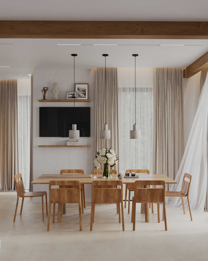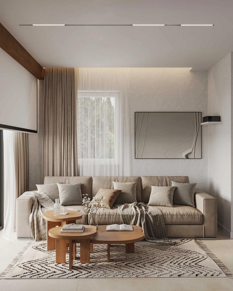 Интерьер выполнен в стиле минимализм с элементами джапанди. В основе — светлый беж, молочный и оттенки серого, дополненные натуральным деревом тёплого тона. Мягкая, спокойная палитра подчёркивает чистоту форм, ощущение света и уюта, а природные материалы создают цельную и гармоничную атмосферу во всём доме.