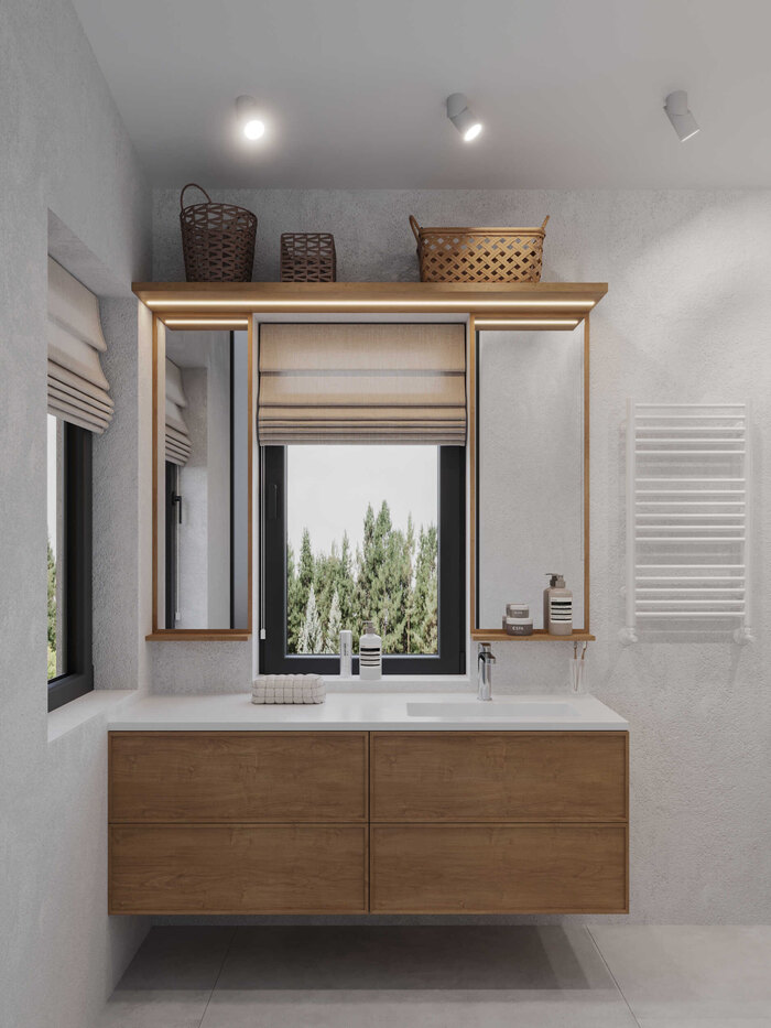 Тумба с раковиной подвесная — под ней легко убирать, и пространство выглядит легче. В ящиках удобно хранить всё, что нужно каждый день, без ощущения захламлённости. Над раковиной — зеркало с подсветкой, которое даёт комфортный свет утром и вечером..