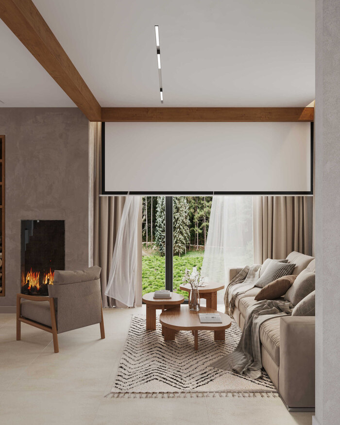 Заказчики сразу сказали, что не хотят телевизор, а хотят проектор. Мы встроили экран в потолок — в обычное время его просто не видно, и ничто не отвлекает взгляд. Когда собираются всей семьёй посмотреть фильм или мультики, экран опускается, и гостиная легко меняет сценарий.