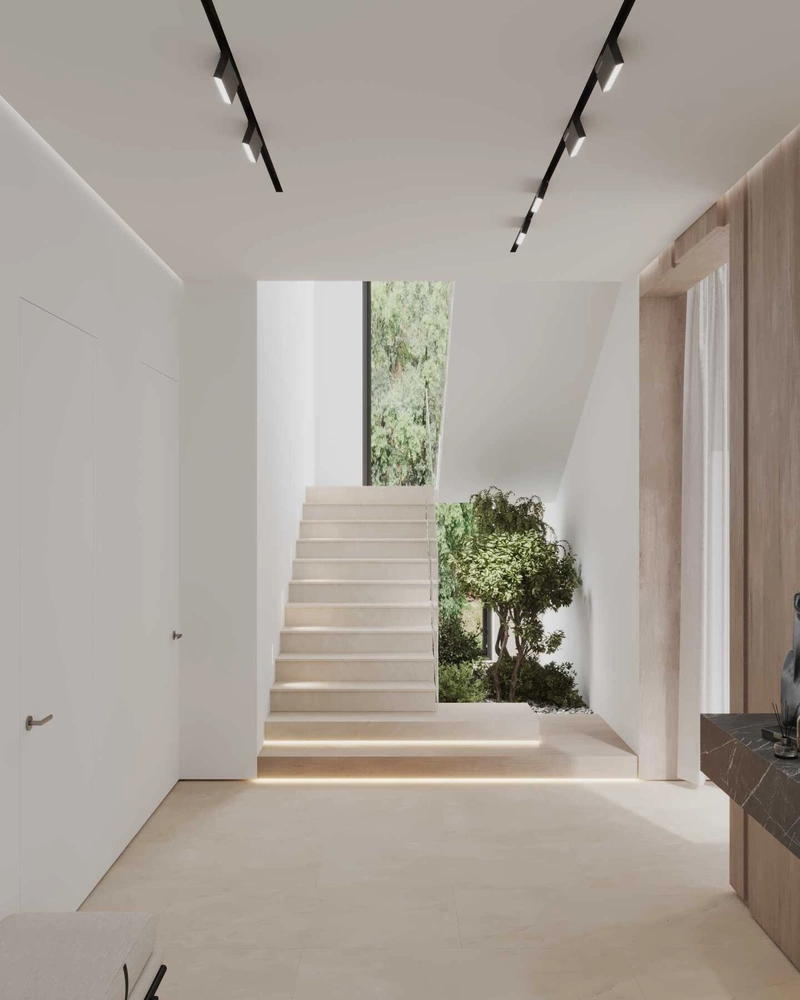 Пространство первого этажа спроектировано так, что холл и лестничная зона перетекают друг в друга без жёстких границ. Стеклянное ограждение и архитектурное освещение усиливают ощущение воздушности и масштаба.