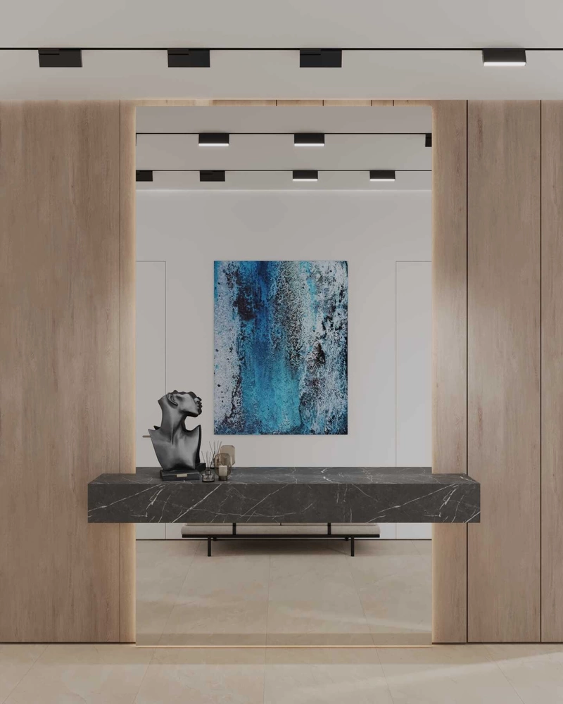 Просторный холл решён в духе минимализма — максимум воздуха, чистые плоскости и свет. В интерьере только необходимое: банкетка, консоль из тёмного камня и большое зеркало. В потолке — трековая система освещения в два параллельных ряда. Такое решение дает равномерный свет и подчеркивает геометрию помещения.