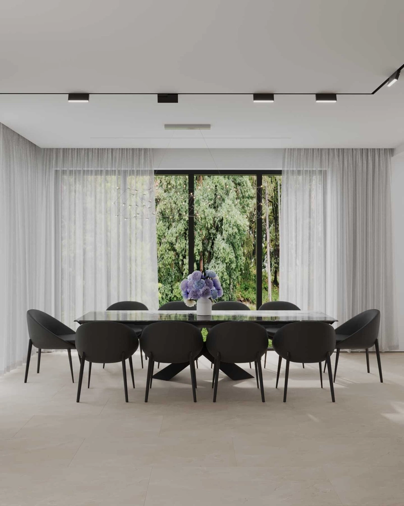 Один из важных запросов заказчиков — вместительный обеденный стол. В проекте предусмотрена полноценная столовая группа на 10 персон, расположенная у панорамных окон.