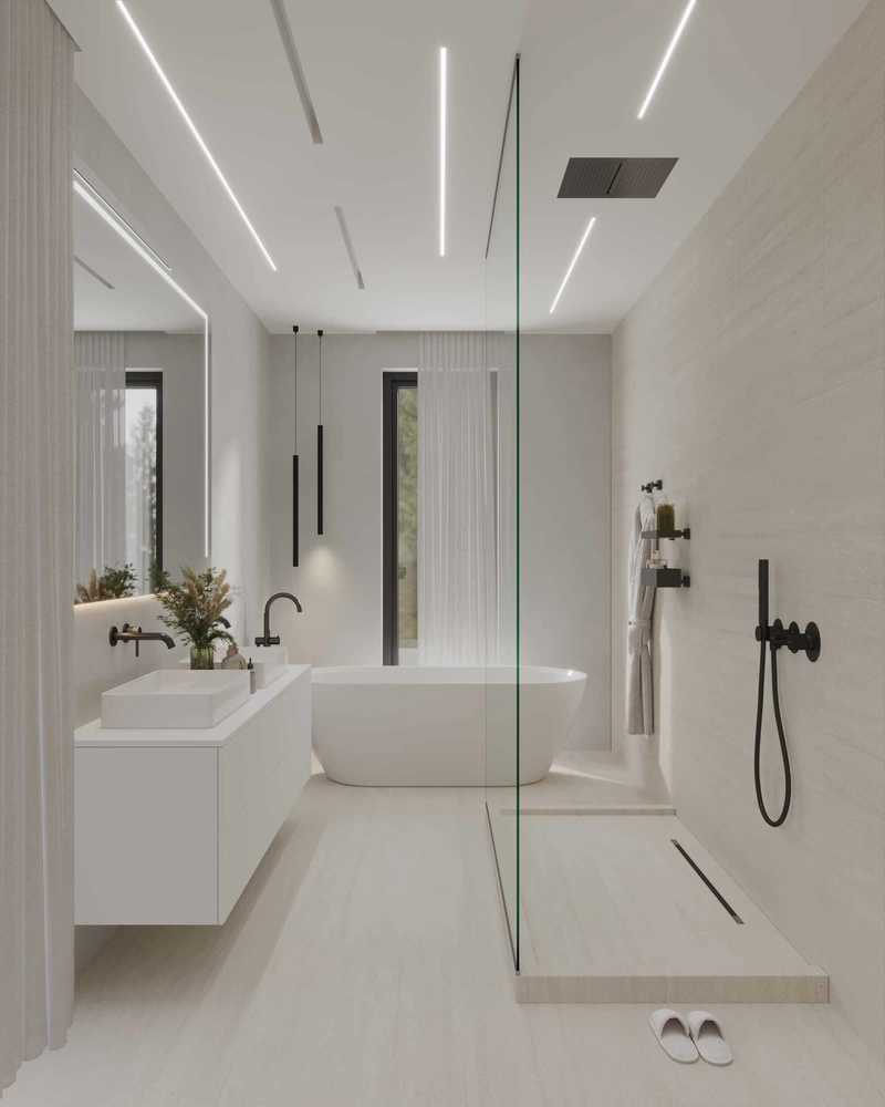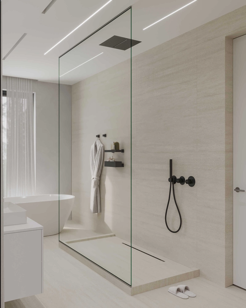 Одним из ключевых пожеланий заказчиков была просторная ванная с двумя раковинами, потолочным душем и стеклянными перегородками. Всё реализовано точно и аккуратно. Но главное — два полноценных окна в ванной комнате, что стало настоящей архитектурной находкой. Такое решение встречается редко, но даёт невероятный эффект: свет, объём и ощущение spa-пространства. Именно эта деталь делает ванную не просто функциональной, а атмосферной и выразительной.