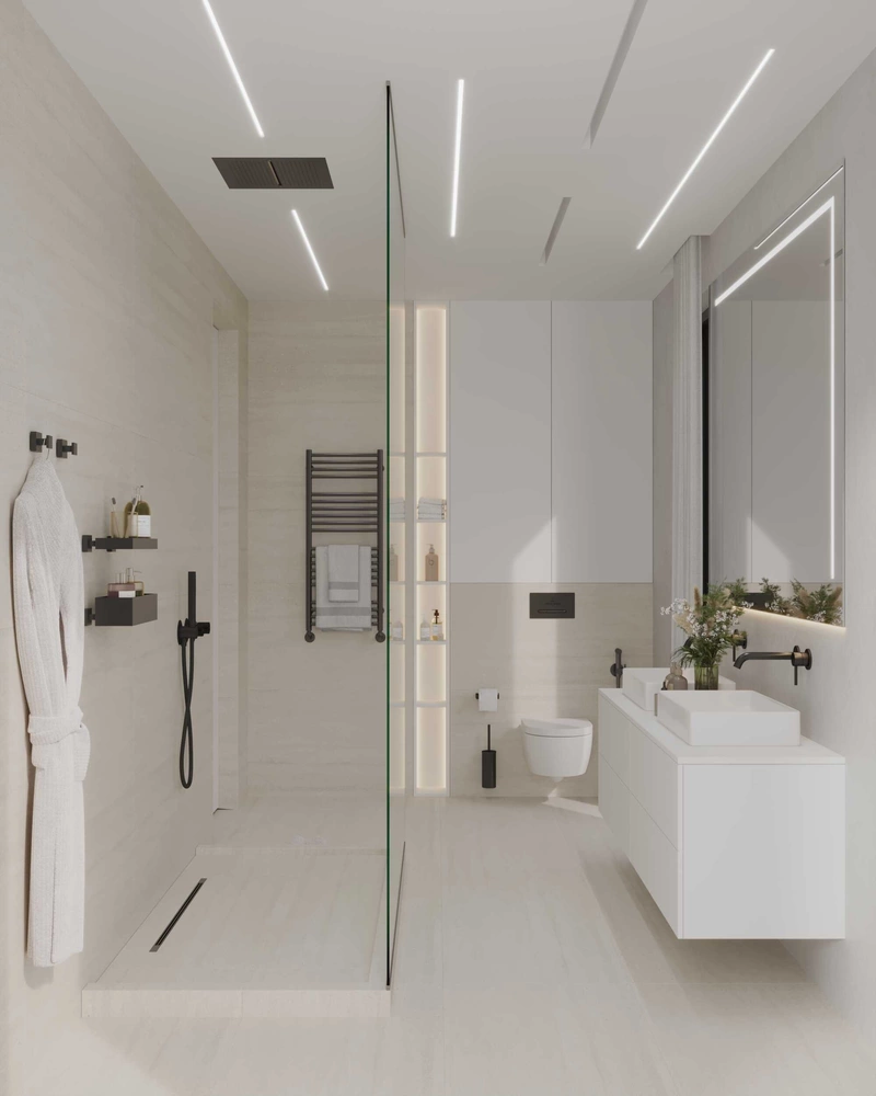 - Чёрная фурнитура и профили — в сантехнике, освещении и мебели — усиливают графику и современный характер интерьера.