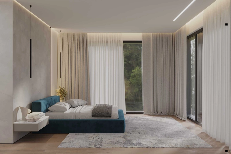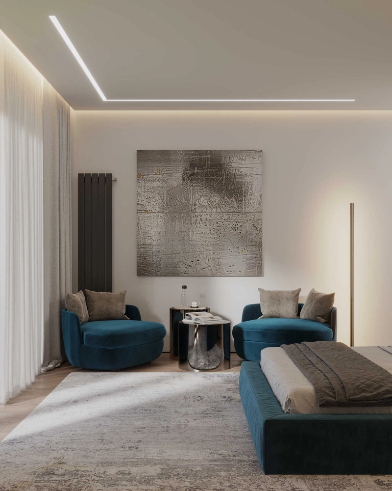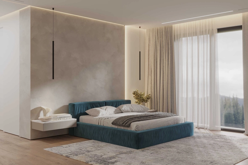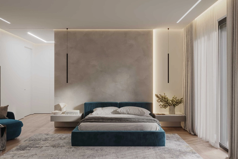 Мастер-спальня спроектирована как камерное, но светлое пространство с выходом на террасу. Центр композиции — низкая кровать с мягким изголовьем в насыщенном бирюзовом оттенке. Стена за изголовьем оформлена фактурной штукатуркой и дополнена контурной подсветкой — она задаёт глубину и создаёт мягкое рассеянное свечение.