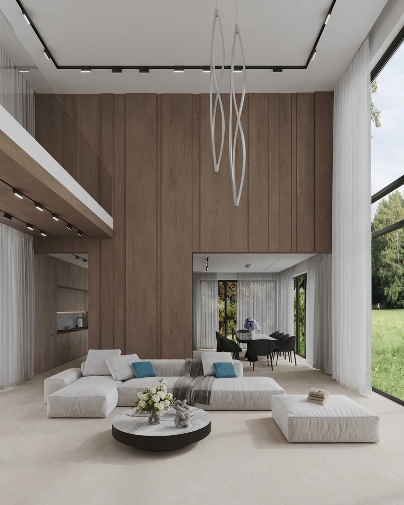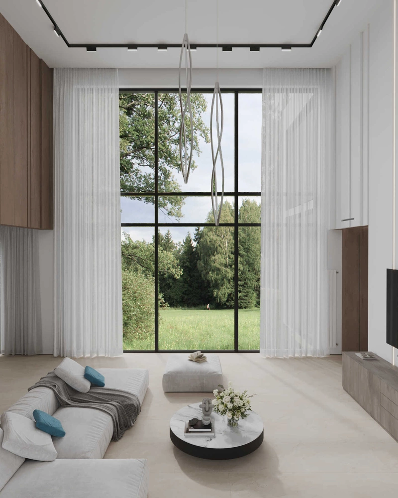 Заказчики хотели ощущение свободы и архитектурности, без перегруза деталями. Дизайнер реализовал эту идею через двухсветное пространство, панорамное остекление и минималистичный подход к меблировке.