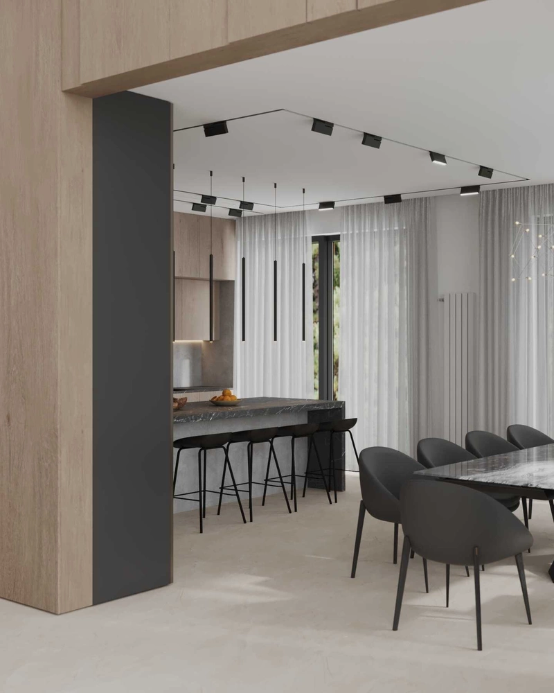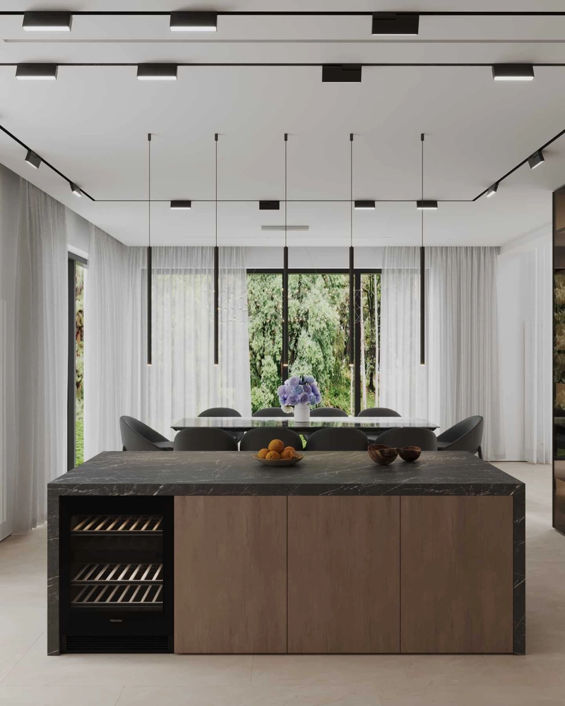 - Чёрные элементы — встроенные профили, светильники, фурнитура — добавляют графики и ритма.