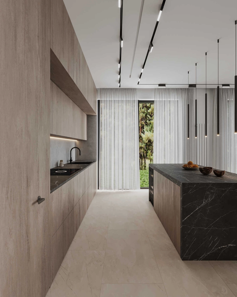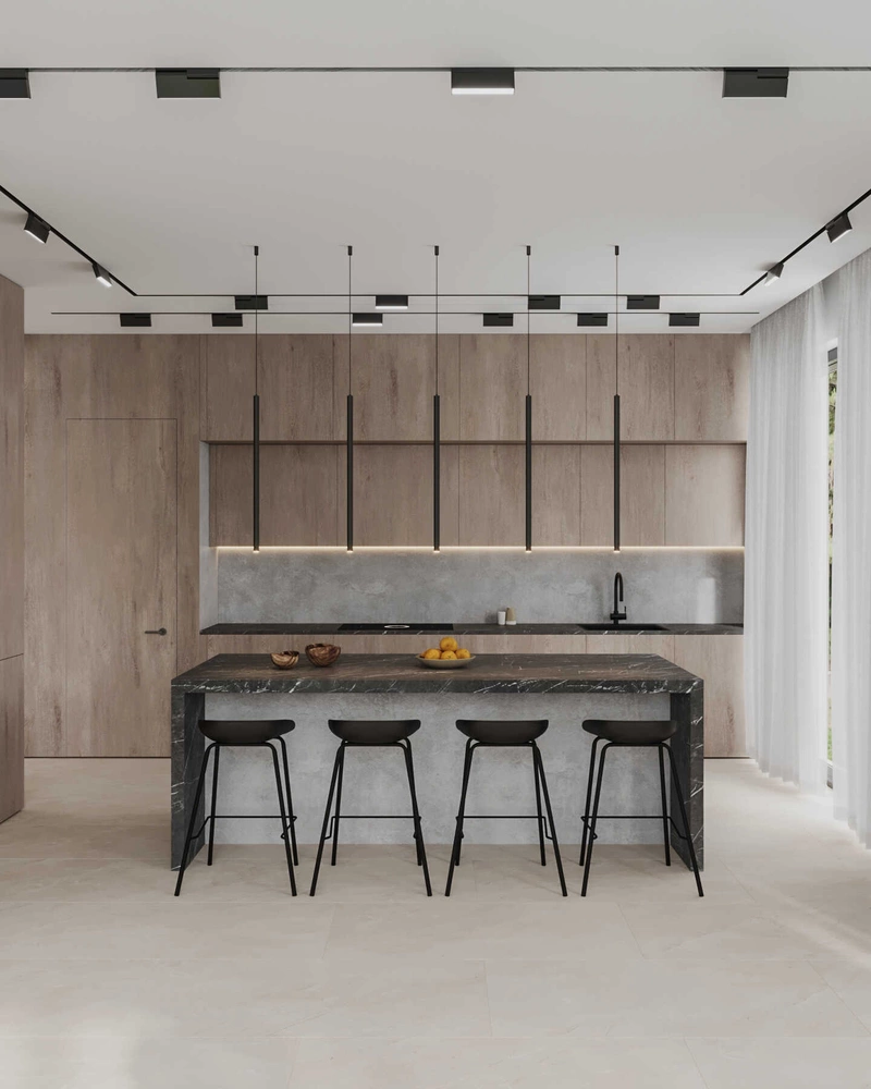 - Камень тёмных оттенков — акценты на кухонной столешнице, консолях и острове. Создаёт контраст и подчёркивает геометрию.