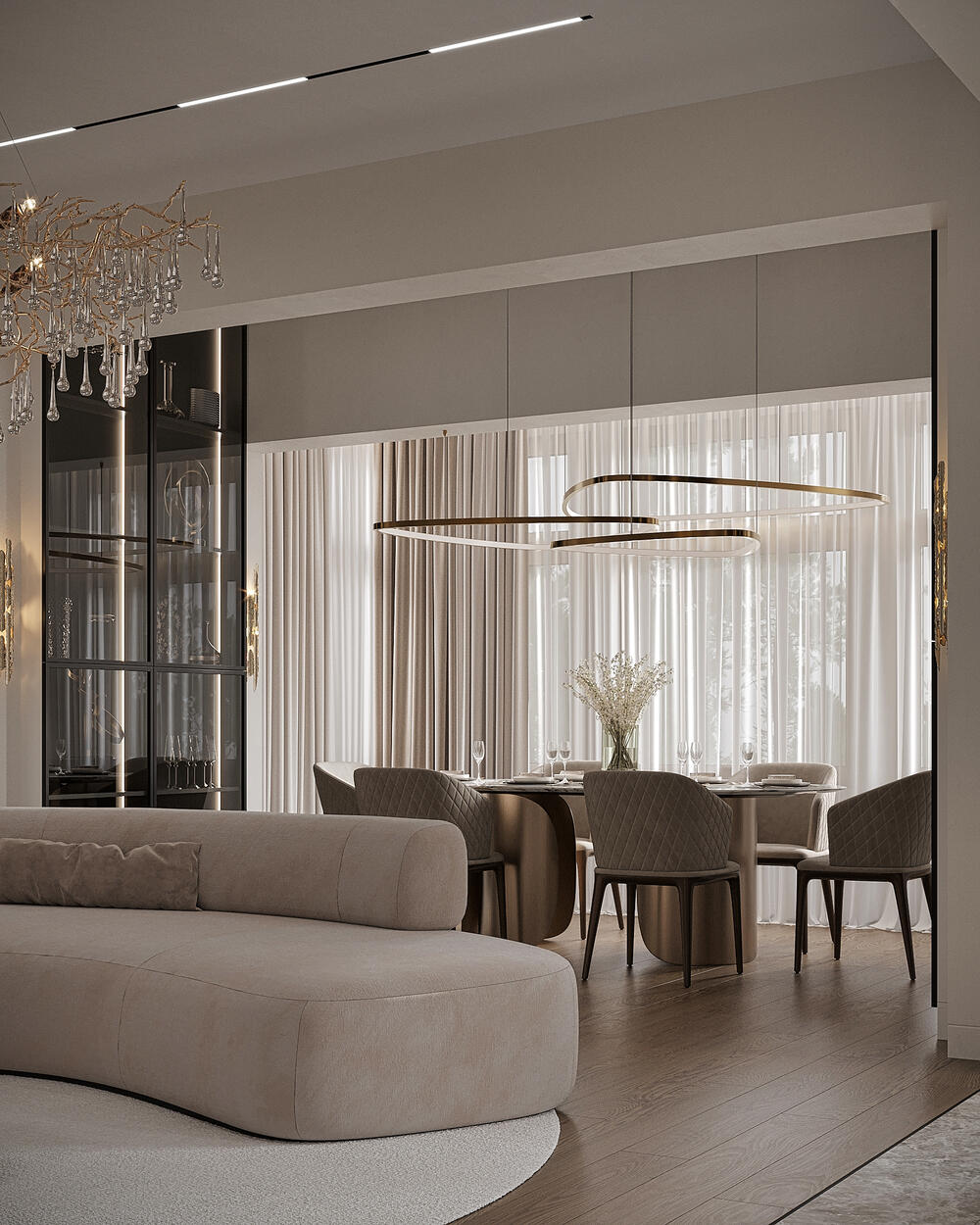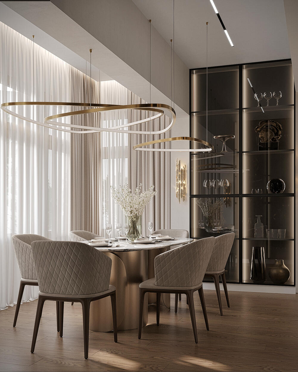 В центре внимания — роскошный обеденный стол с каменной столешницей и мягкие стулья с текстильной обивкой. Такое сочетание не только выглядит элегантно, но и гарантирует комфорт даже для долгих семейных ужинов.