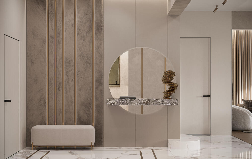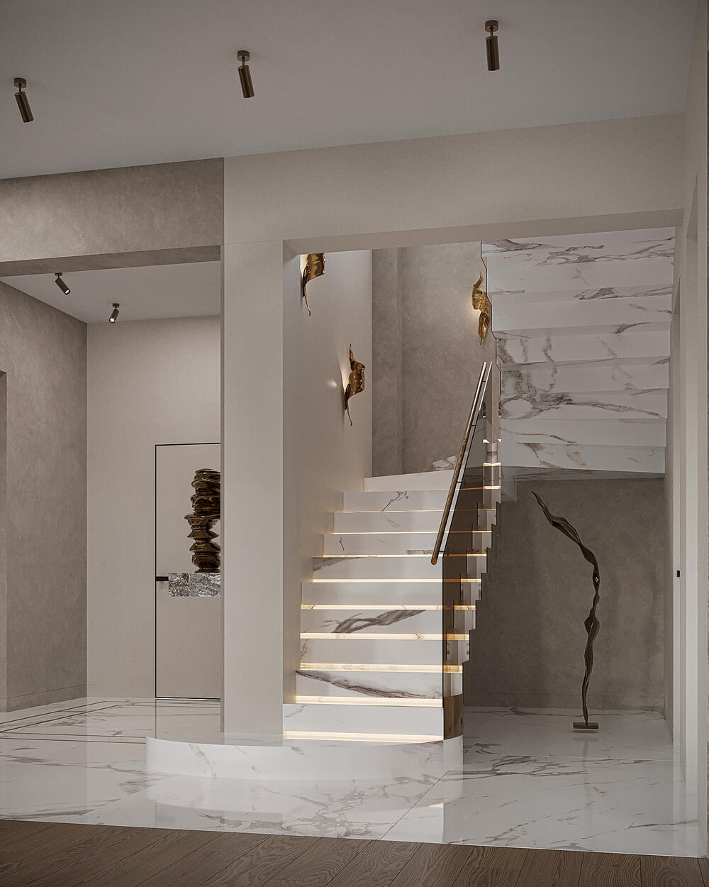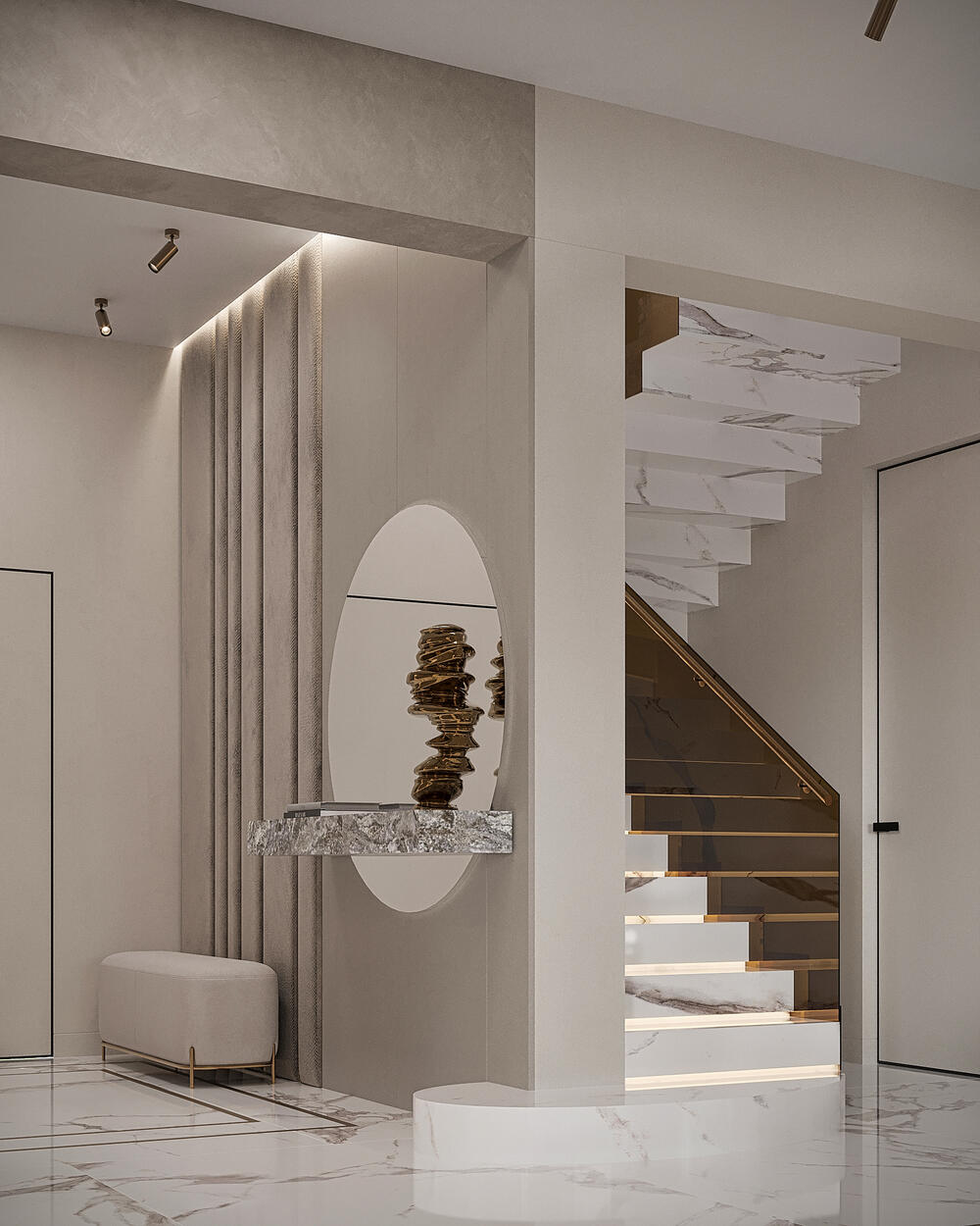 Зеркальные вставки и стеклянные ограждения лестницы усиливают эффект простора, а декоративные элементы в виде картин и скульптур делают интерьер живым и индивидуальным.