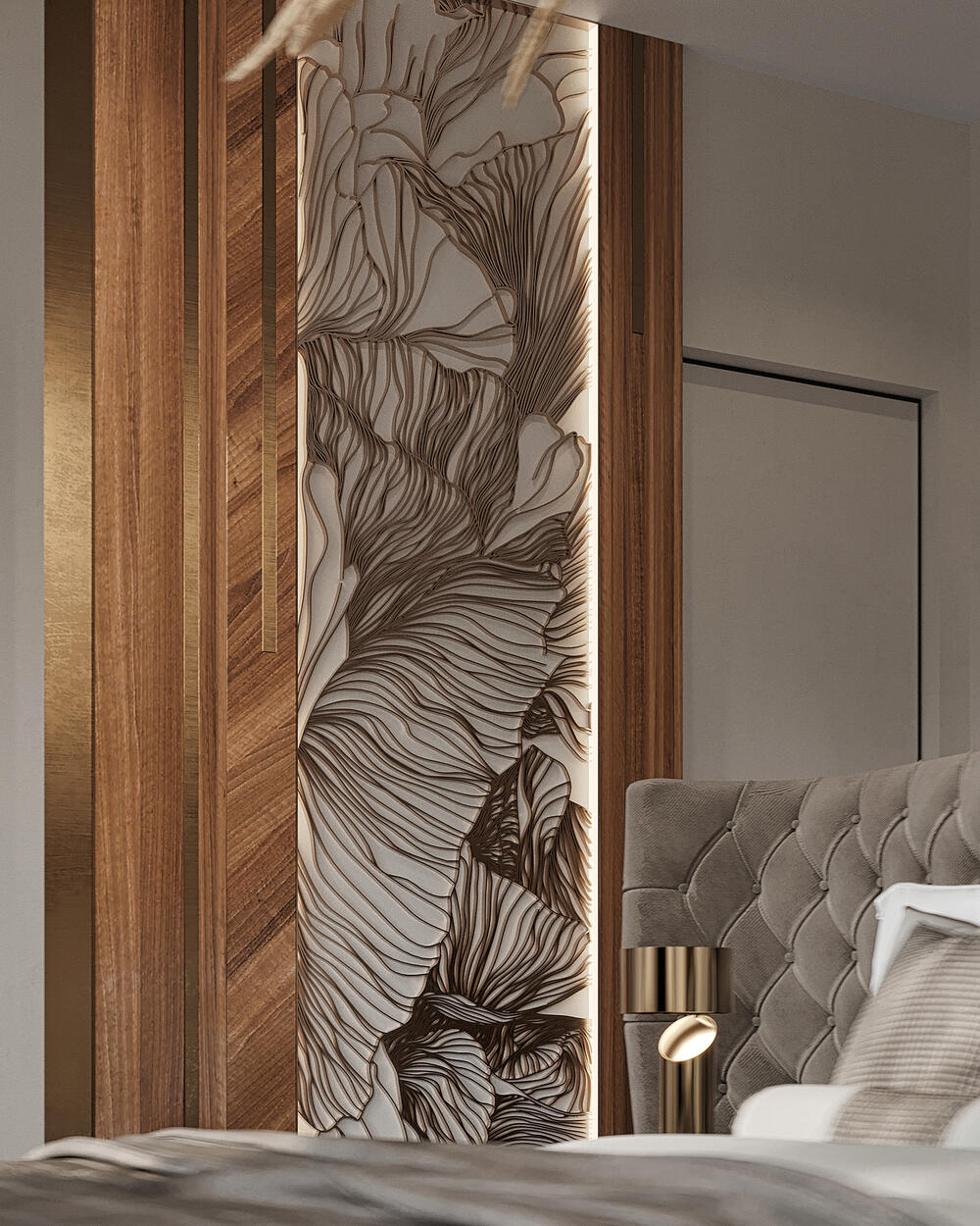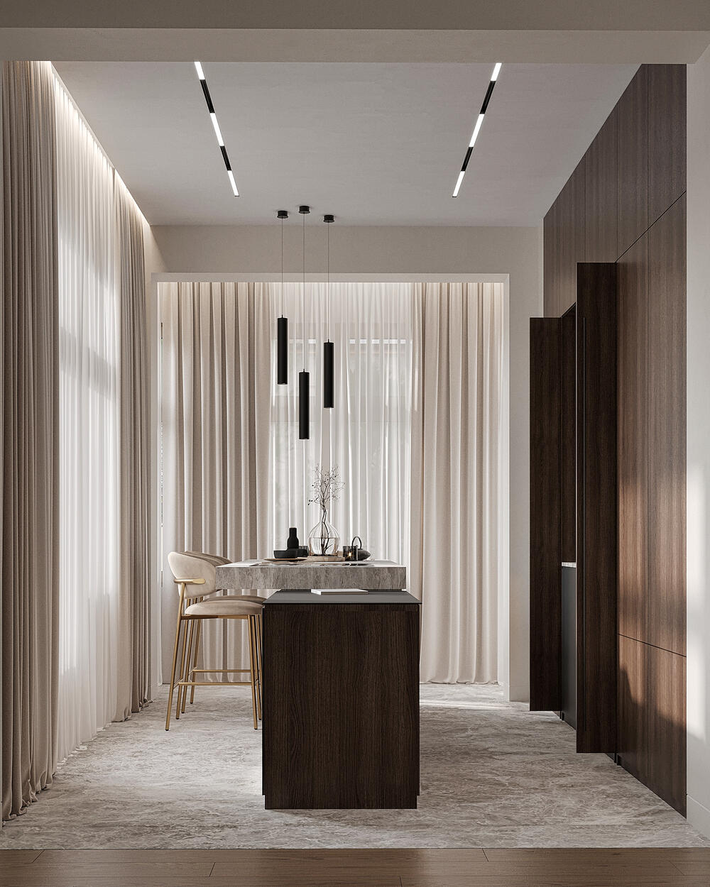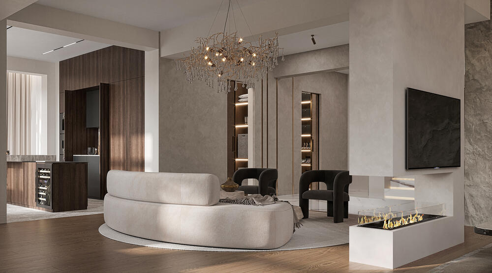 Интерьер выдержан в теплой натуральной палитре с акцентом на благородные материалы — дерево, камень и текстиль. В ванных комнатах использован натуральный мрамор с эффектным сочетанием светлых и темных оттенков, а встроенные системы хранения и функциональная планировка позволяют поддерживать порядок и удобство в каждой зоне.