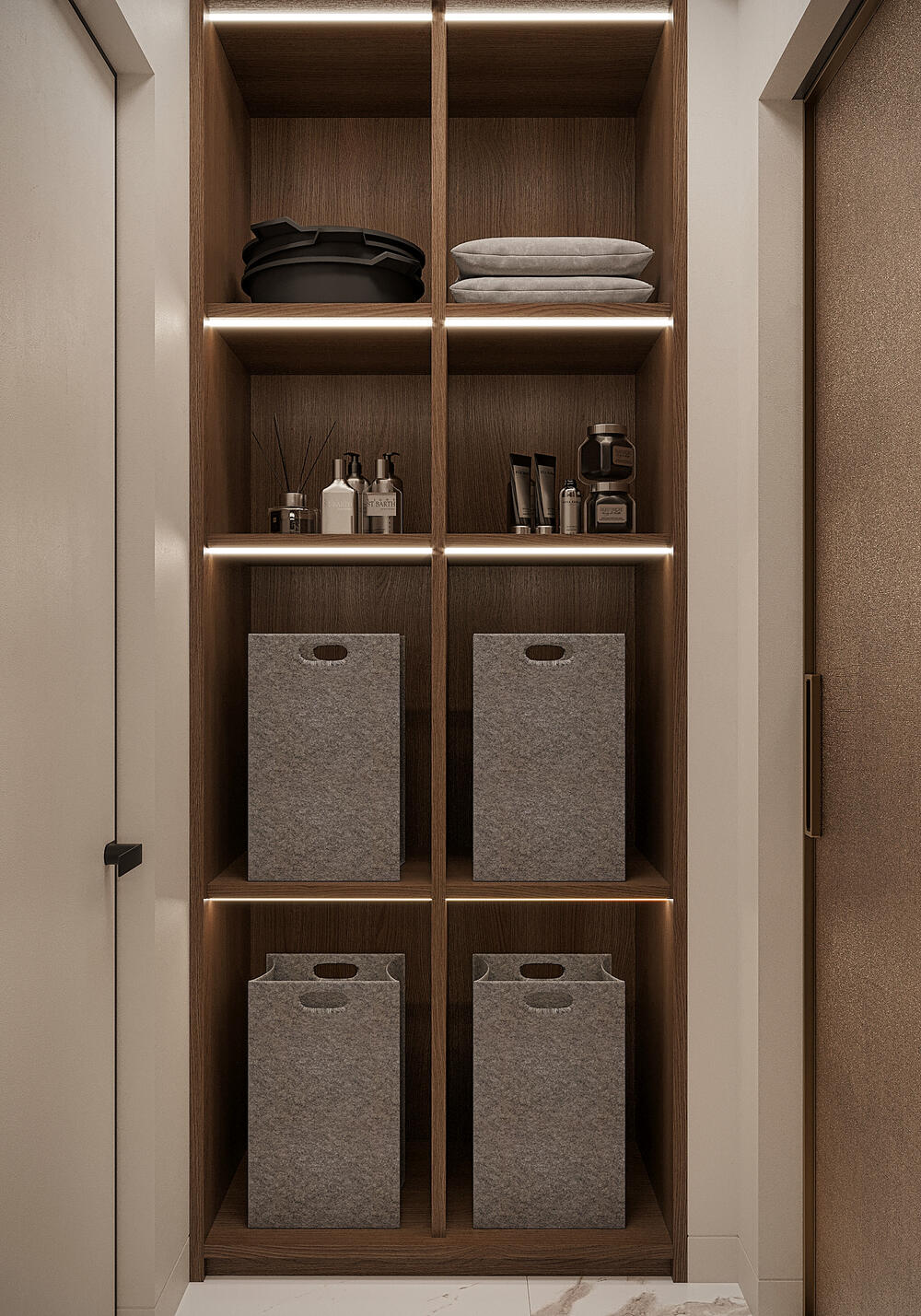 Постирочная расположена в отдельном помещении, что позволяет скрыть все процессы, связанные с уходом за одеждой. Встроенные стиральная и сушильная машины размещены вертикально, что экономит пространство. Рядом расположены системы хранения для бытовой химии, полотенец и аксессуаров. Зонирование постирочной продумано таким образом, чтобы всё необходимое было под рукой, а само помещение не выглядело перегруженным.