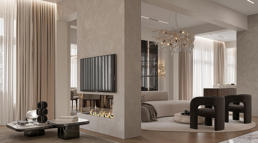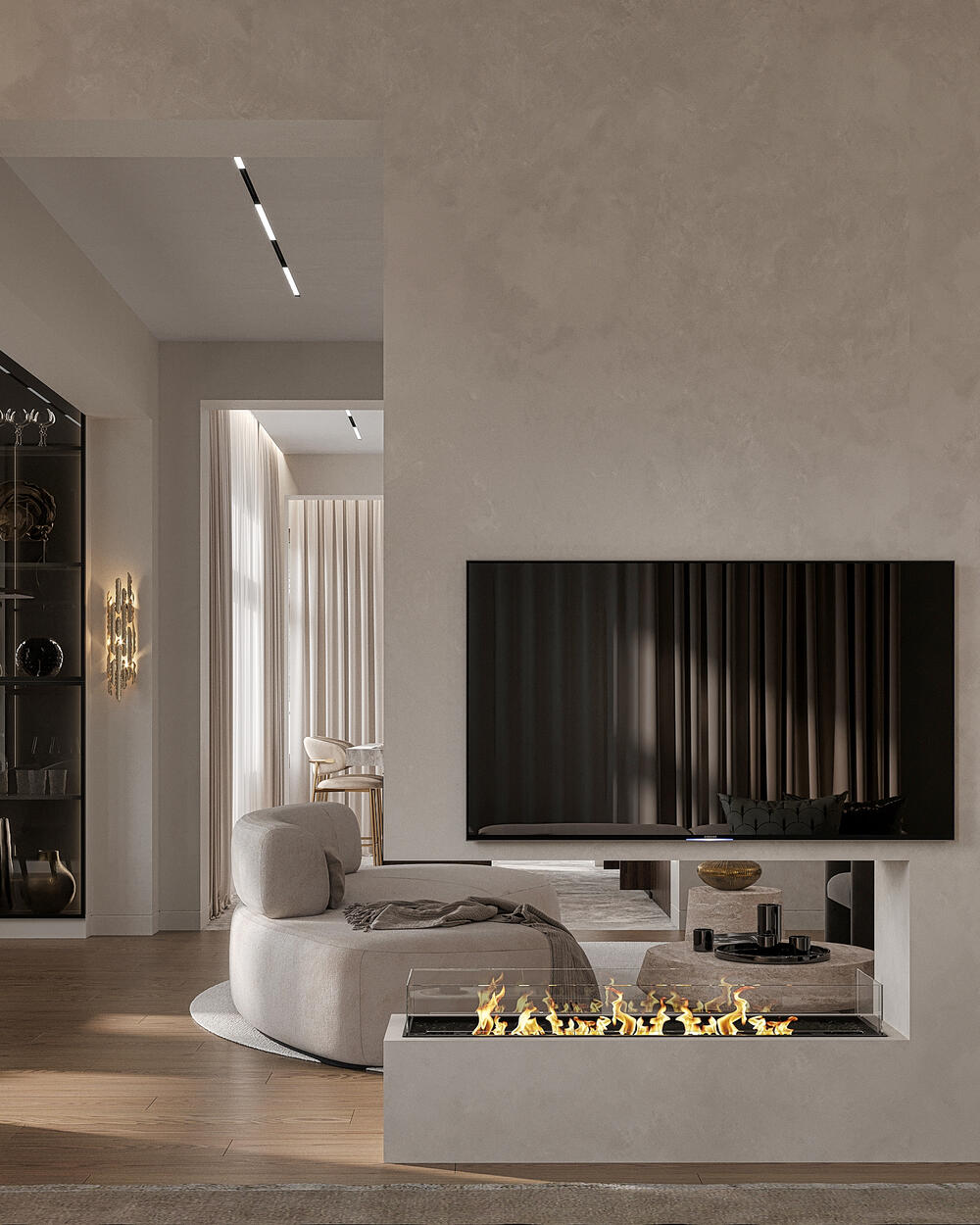 Здесь расположен биокамин, который не просто украшает интерьер, но и добавляет физического и визуального тепла. Грамотно подобранные мягкие кресла и журнальный столик делают это место идеальным для чтения, общения или спокойного отдыха в конце дня.