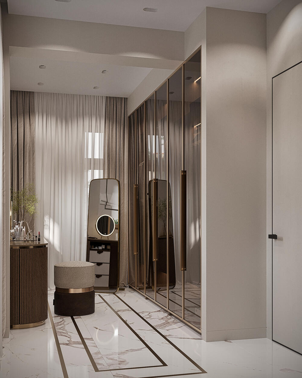 Отдельного внимания заслуживает система хранения. Закрытые стеклянные шкафы с внутренней подсветкой позволяют хранить косметику, парфюм и аксессуары, обеспечивая удобный доступ и безупречный порядок.