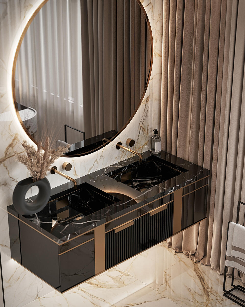 Центральный элемент ванной — тумба с двумя раковинами, выполненная в глубоких чёрных оттенках с глянцевым покрытием. Над ней расположено большое круглое зеркало с мягкой подсветкой. Бронзовые смесители дополняют общую концепцию благородного уюта.