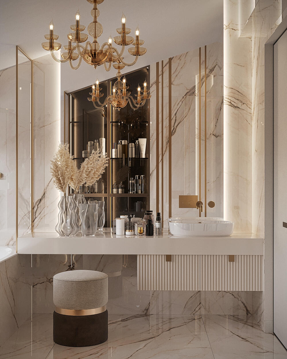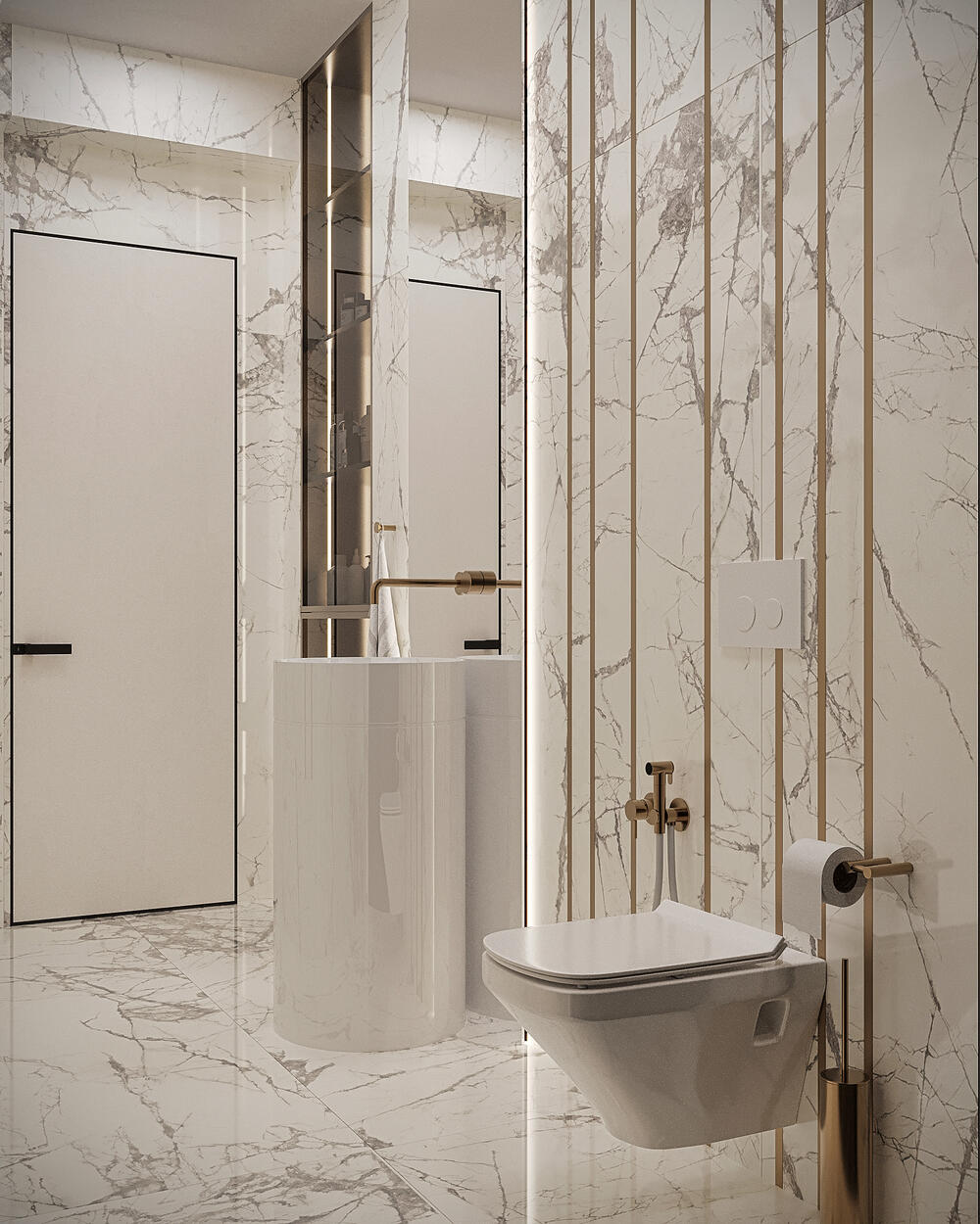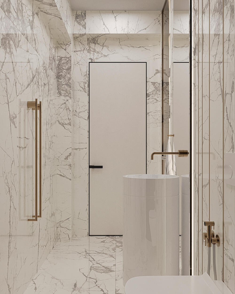 Эта ванная комната выдержана в элегантных светлых тонах с тонкими золотыми акцентами. Отделка выполнена из крупноформатного мрамора с выразительным природным рисунком, что придаёт пространству статусность и гармонию.
