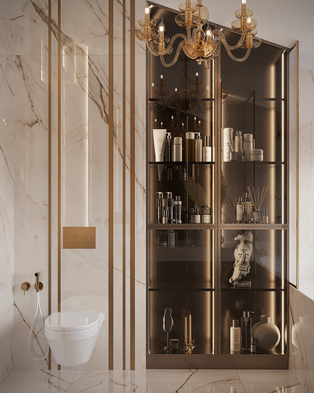 Декоративные золотые вставки на стенах и сантехника с матовым покрытием подчёркивают статусность и утончённость дизайна. Подвесной унитаз с системой инсталляции облегчает уборку, а встроенные полки с подсветкой позволяют удобно хранить косметику и средства гигиены.