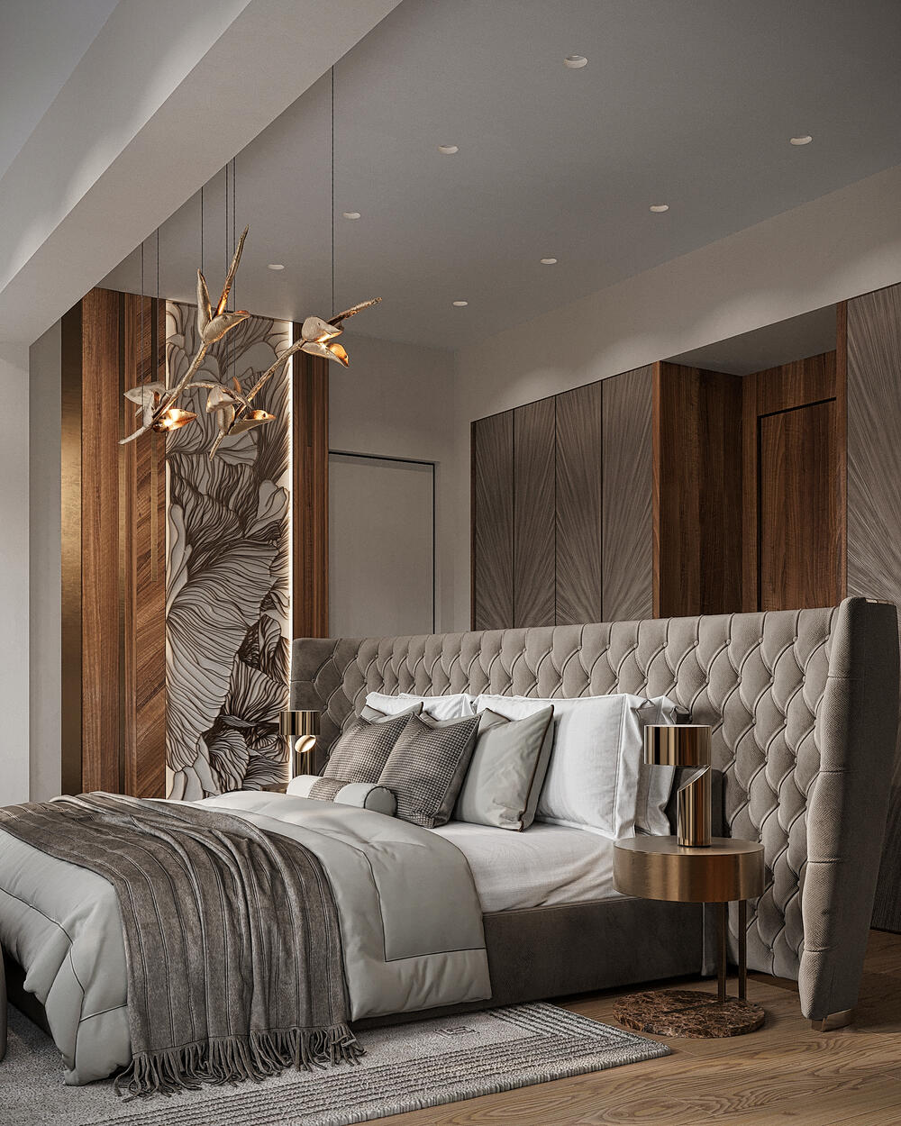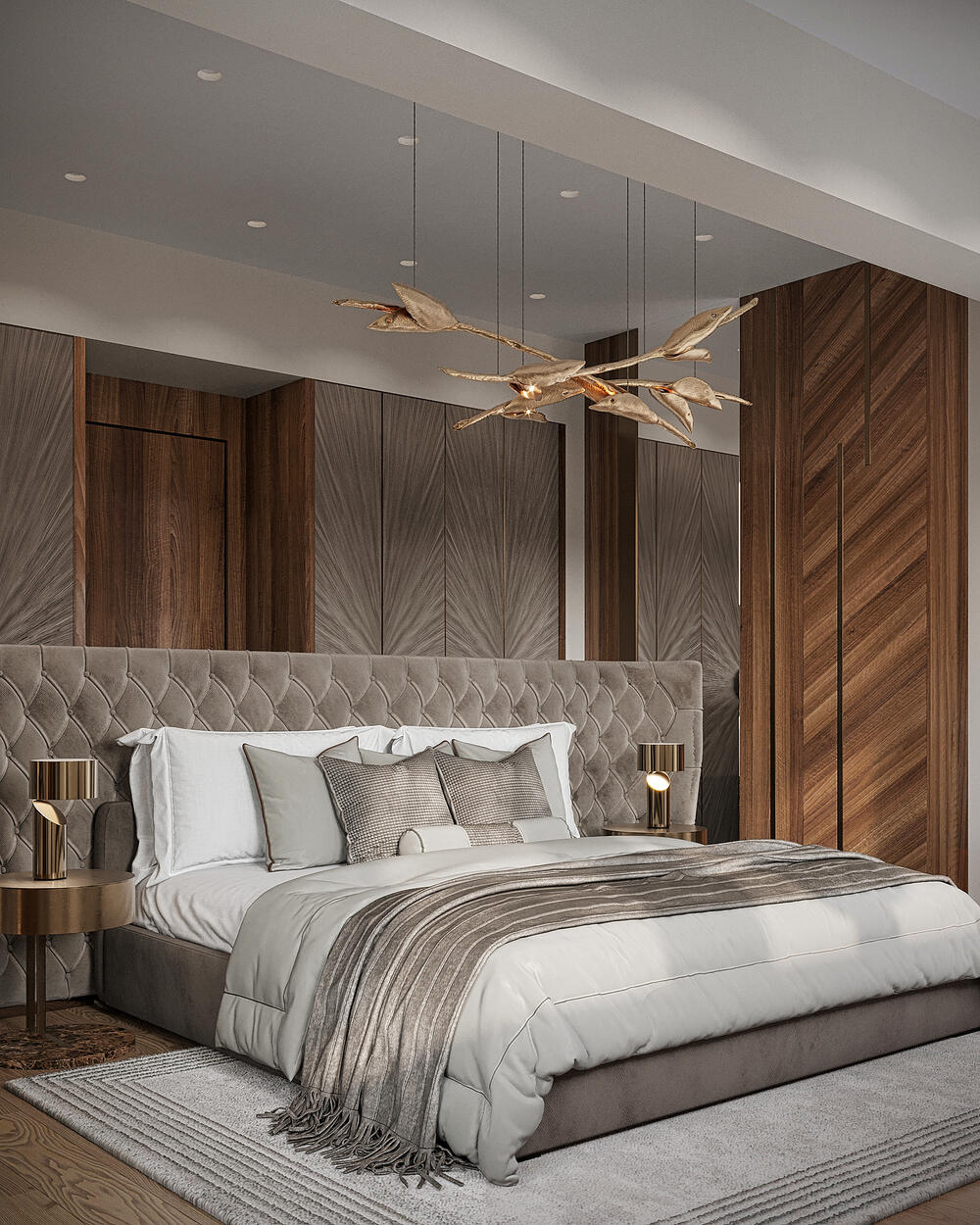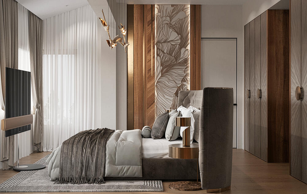 Дизайн выдержан в сдержанной натуральной палитре с акцентом на текстуры: глубокие древесные оттенки, бархатистые ткани и тёплые металлы. Изюминкой спальни стало высокое мягкое изголовье кровати, которое не только подчеркивает статусность интерьера, но и формирует уютную зону отдыха. С двух сторон от кровати расположены компактные прикроватные тумбы с элегантными светильниками, выполненными в латунной отделке. Большие окна пропускают много естественного света, а воздушные шторы из легкого тюля смягчают освещение. Напротив кровати размещена ТВ-зона с лаконичной консолью и стильной акустической системой.