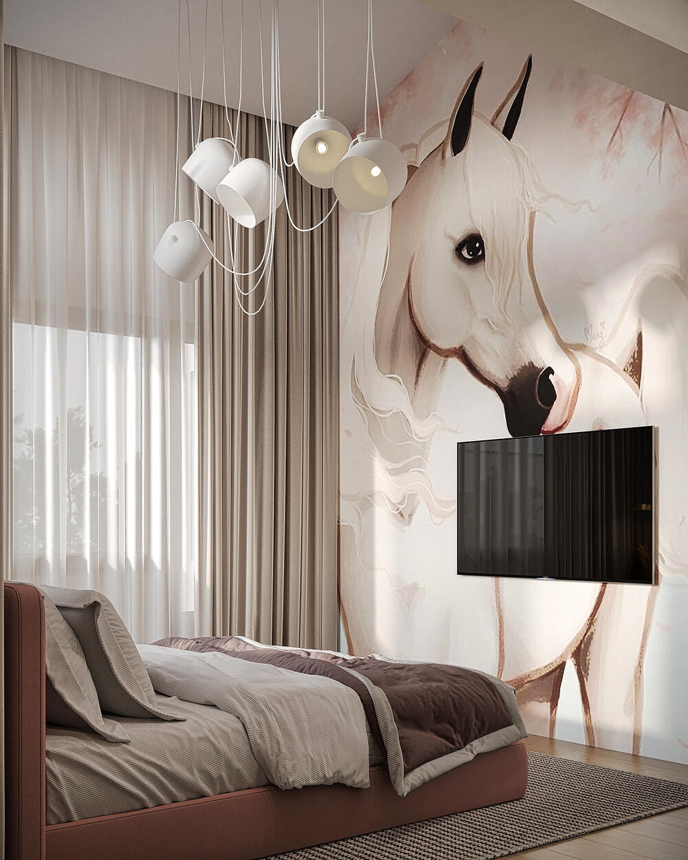 Детская выполнена в мягкой, теплой цветовой гамме. Центральное место занимает кровать с мягким изголовьем, а изюминкой интерьера стала стена с художественной росписью в виде белоснежной лошади. Рабочая зона интегрирована в систему хранения: удобный стол с полками позволяет организовать учебное пространство.