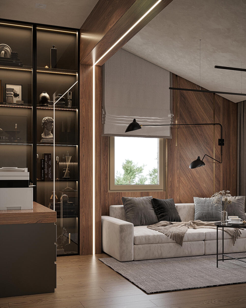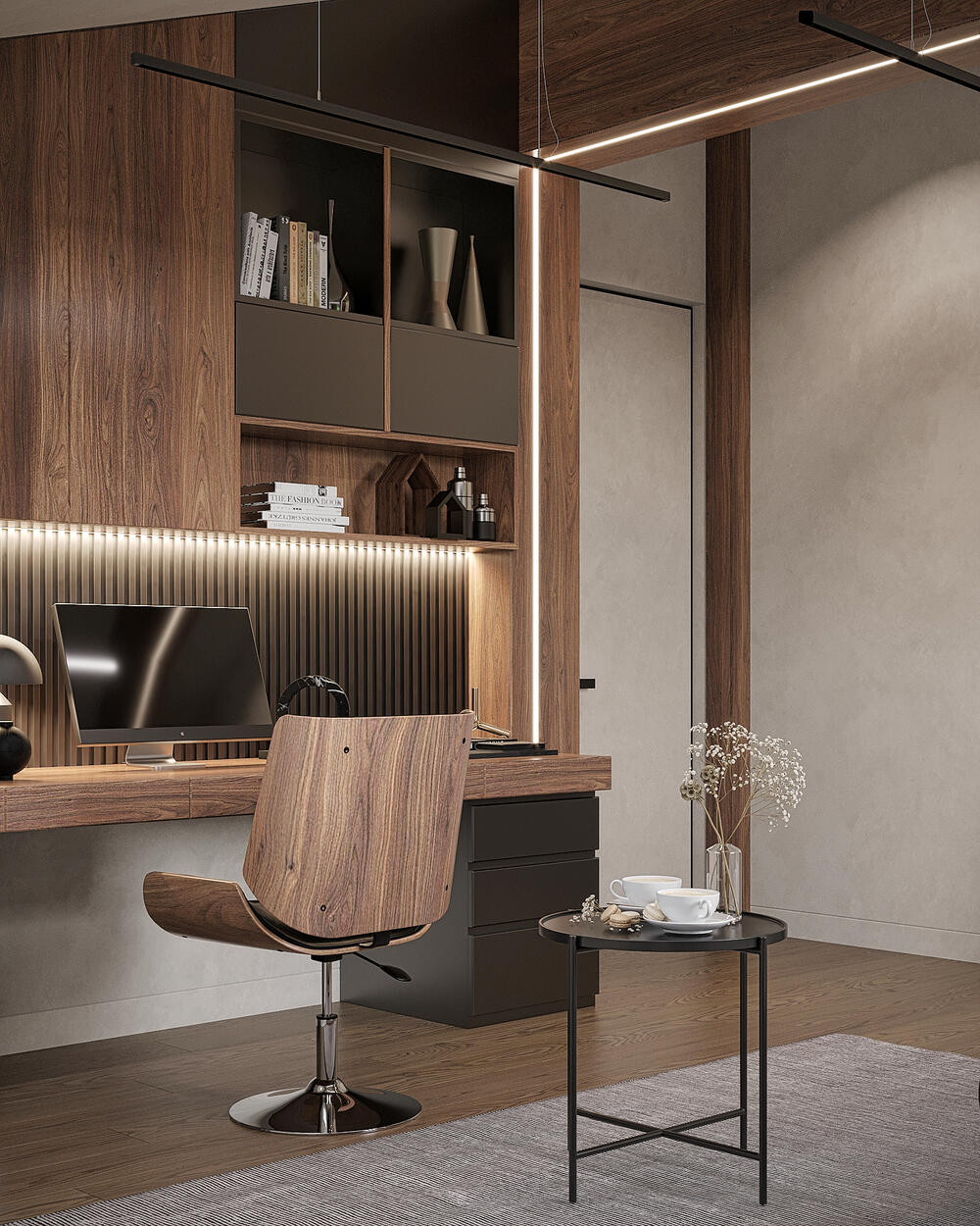 Кабинет выполнен в спокойных древесных оттенках, создающих концентрацию и рабочее настроение. В центре — стол из натурального шпона с удобным офисным креслом. Стена за рабочей зоной оформлена системой закрытых и открытых полок для хранения документов, книг и аксессуаров. Мягкий диван в зоне отдыха делает кабинет многофункциональным, позволяя использовать его не только для работы, но и для расслабления в уютной атмосфере.