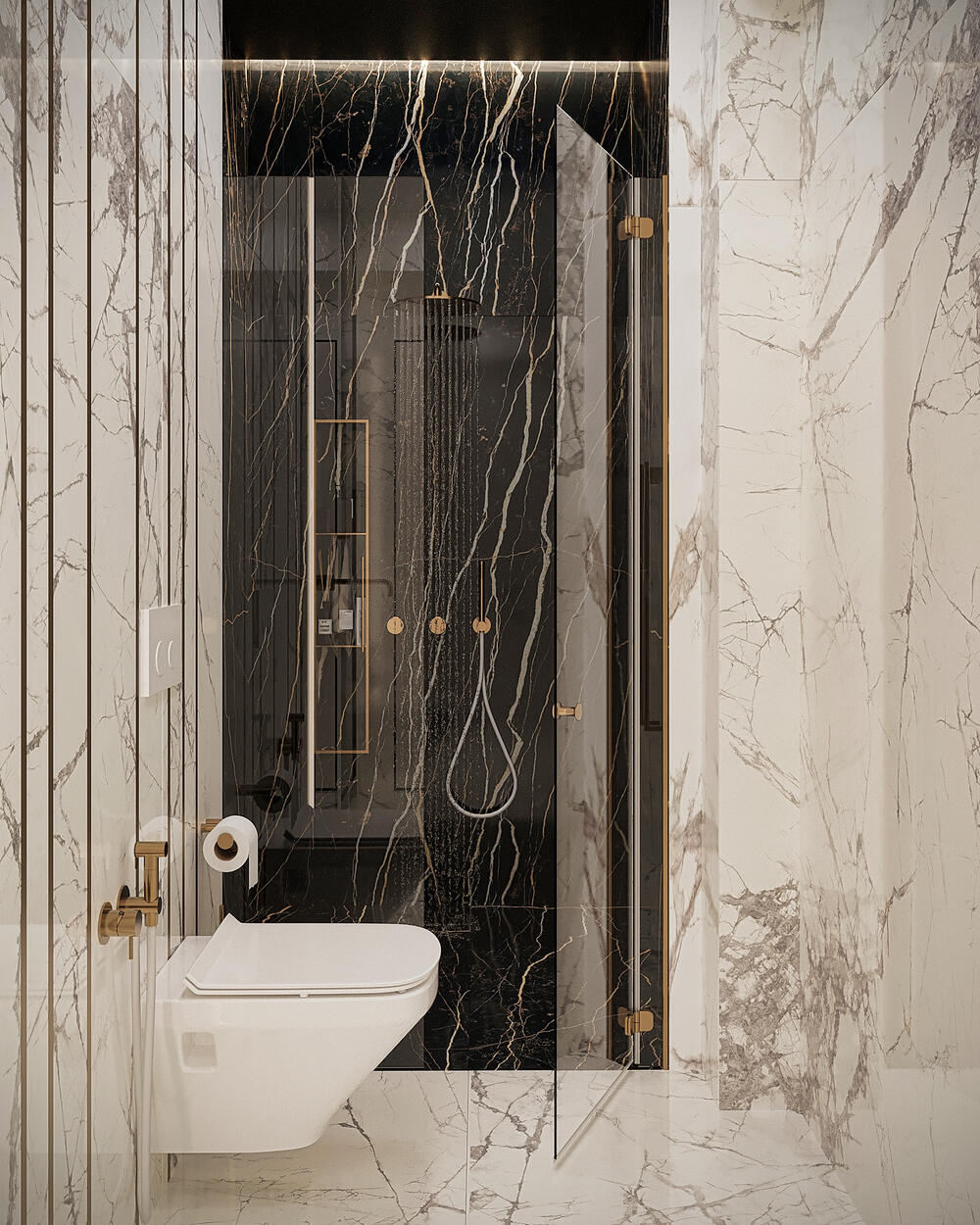 Душевая зона оформлена в контрастных оттенках: глубокий тёмный мрамор с тонкими золотыми линиями. Встроенные ниши с подсветкой позволяют удобно хранить косметику и средства ухода, а потолочный душ с эффектом тропического дождя усиливает ощущение релакса.