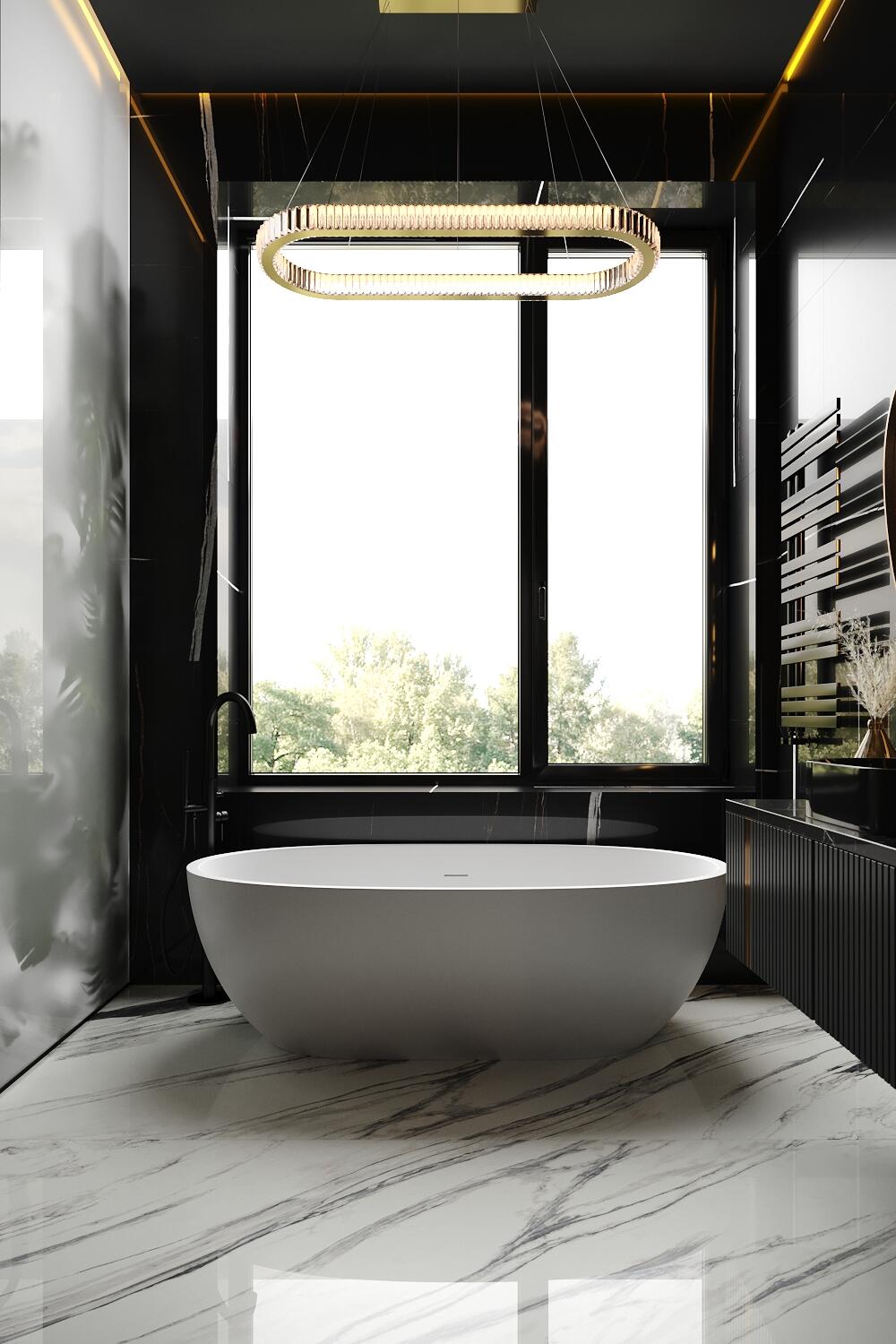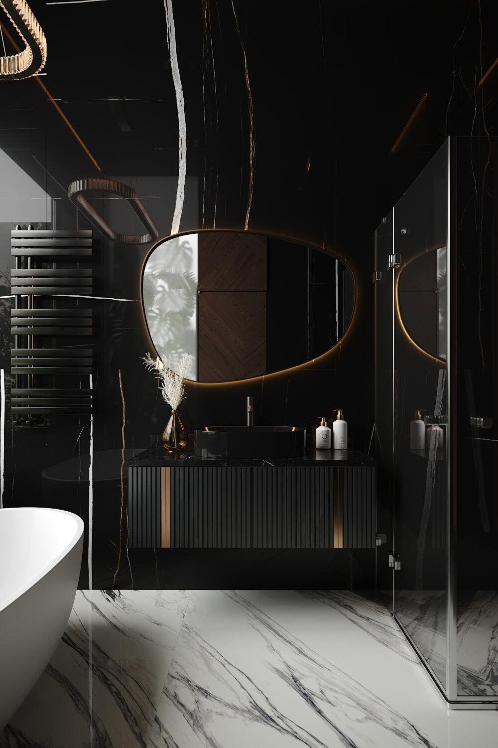 Здесь дизайн работает на эмоцию. Контраст тёмных глянцевых стен и светлого мрамора — про эффект. Отдельностоящая ванна у окна, чёрная раковина, рифлёная тумба с латунью. Зеркало — овальное, с мягкой подсветкой. Выразительная люстра завершает образ.