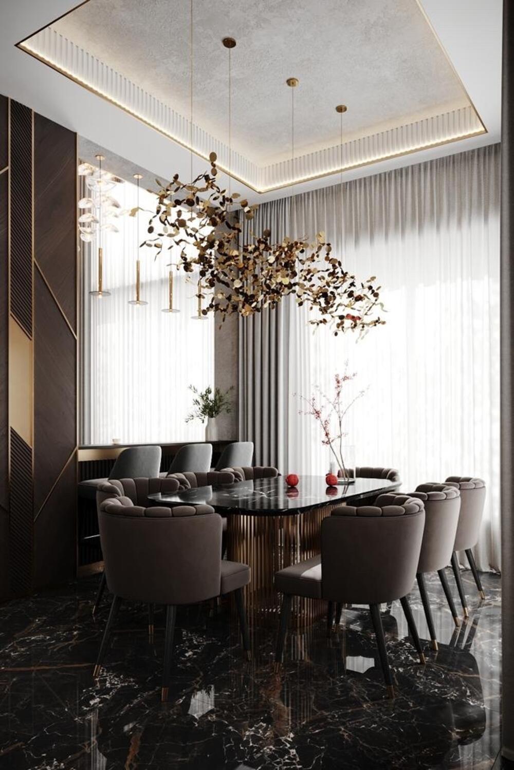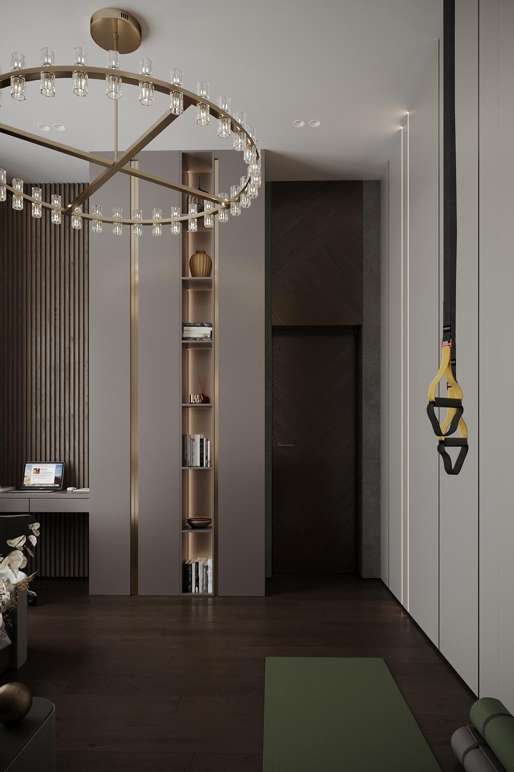 В столовой зоне глянцевый мраморный стол, будто высеченный из ледника. Над ним — скульптурная люстра с латунными лепестками. Стены отделаны геометрическими панелями, которые задают ритм и глубину. Атмосфера — как в бутиковом ресторане. Но с домашним комфортом.