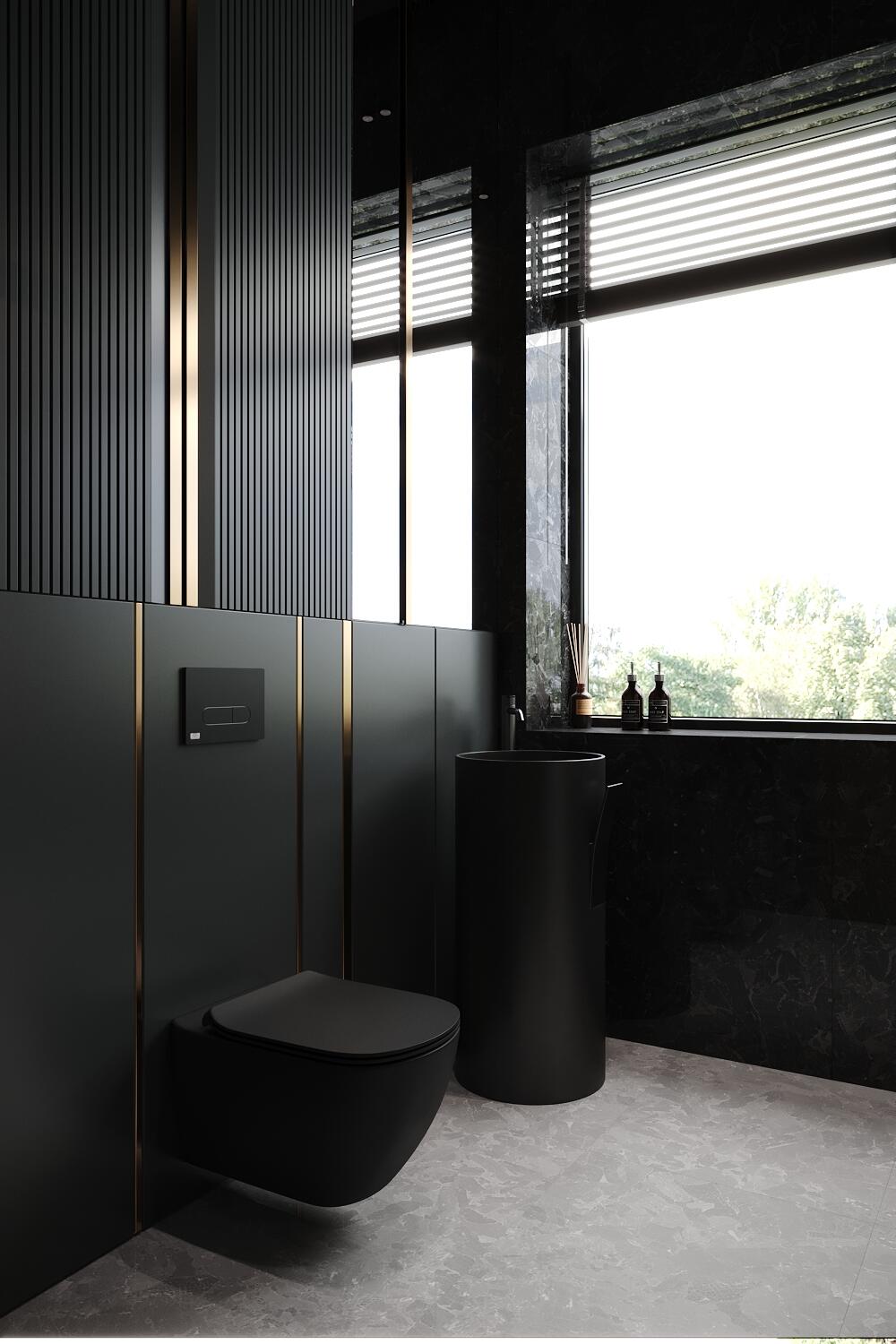 Сантехника — чёрная, лаконичная, но с характером. А раковина и столешница из тёмного мрамора с прожилкой — это просто вау! Очень тактильно, очень дорого и в то же время практично. В целом — это не просто санузел, а полноценное маленькое пространство комфорта с дизайнерским лицом.