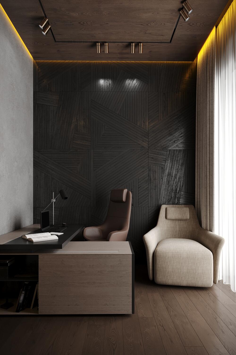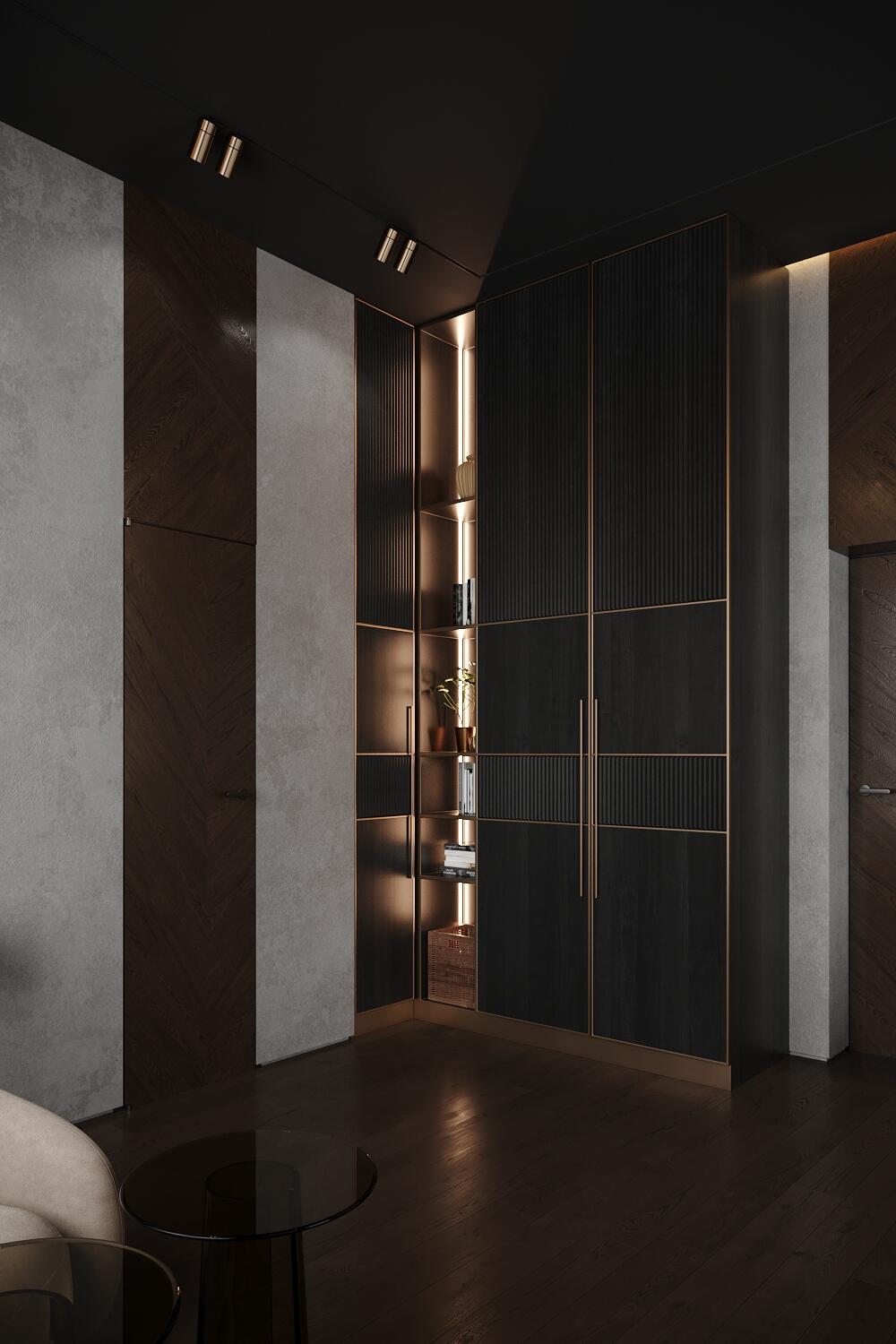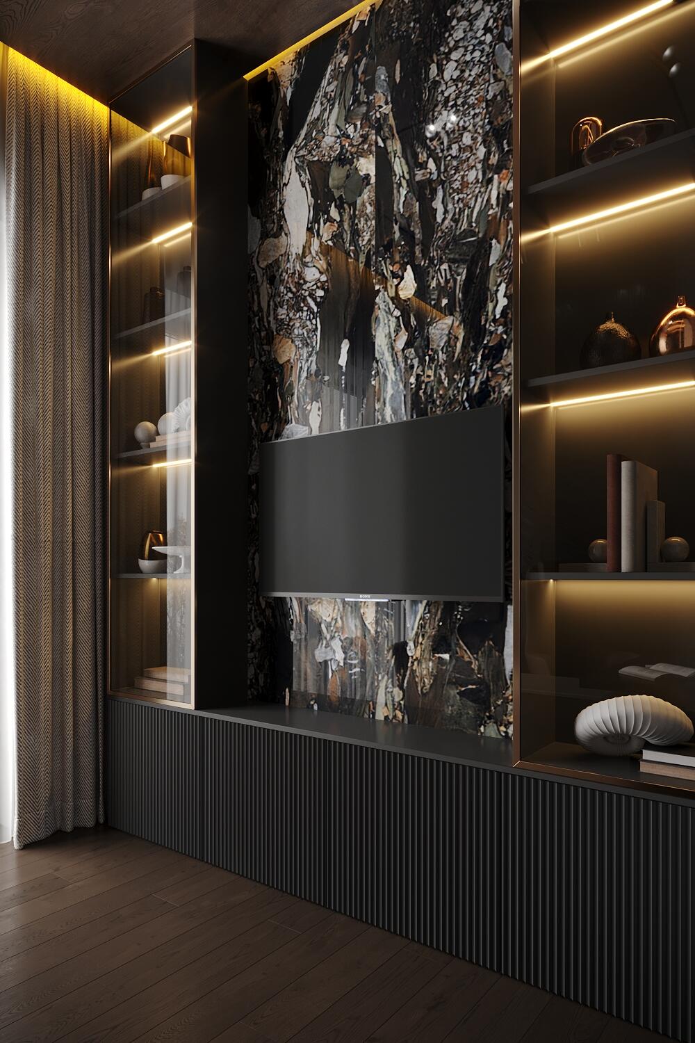 Интерьер построен на глубоких тёмных оттенках, графитовых панелях и выразительном камне. Золотистые акценты — прям в точку: добавляют немного шика, но не перебивают общее настроение.