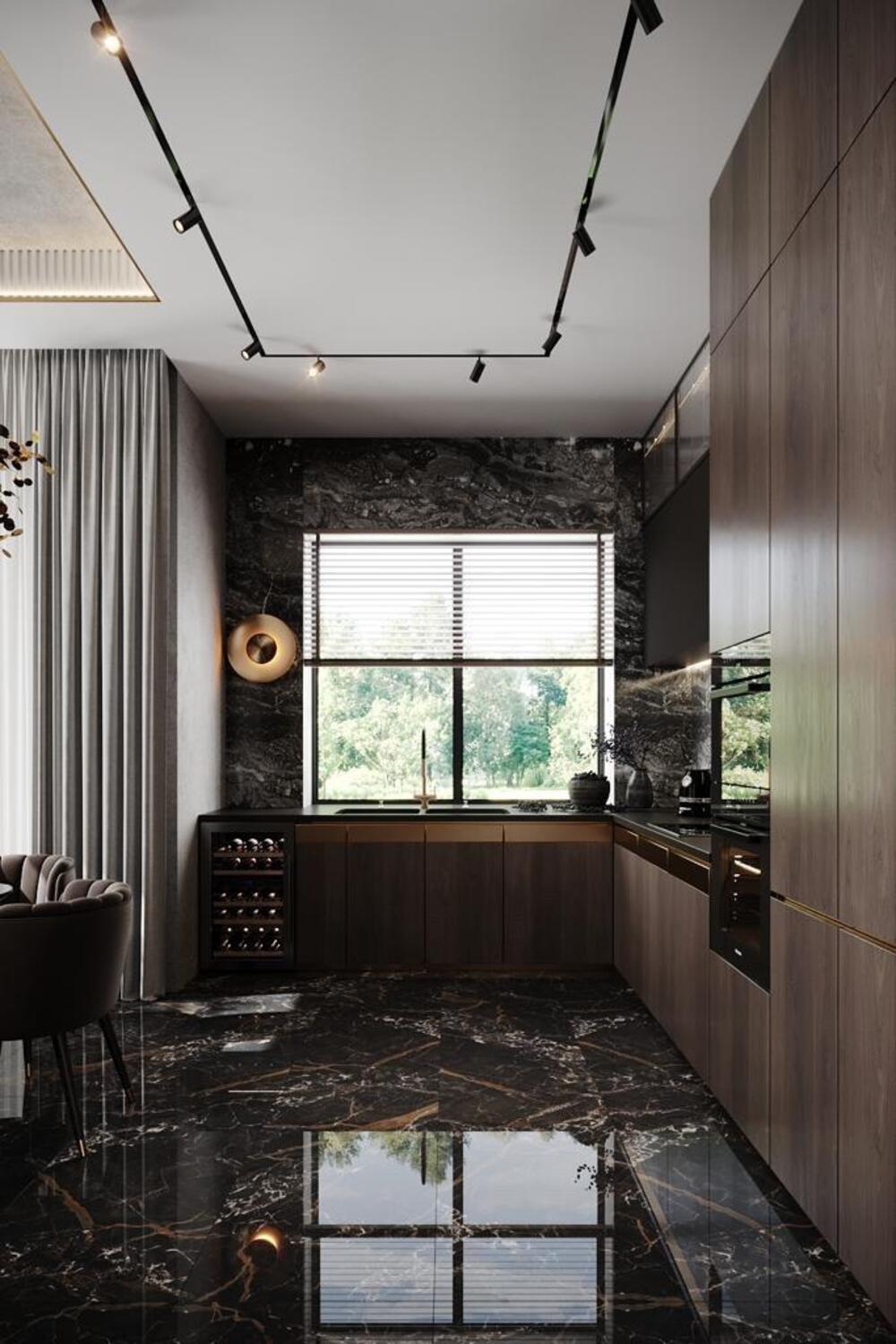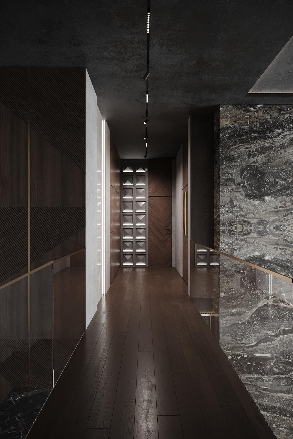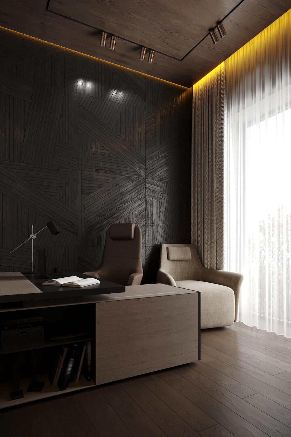 Интерьер построен на глубоких тёмных оттенках, графитовых панелях и выразительном камне. Золотистые акценты — прям в точку: добавляют немного шика, но не перебивают общее настроение.