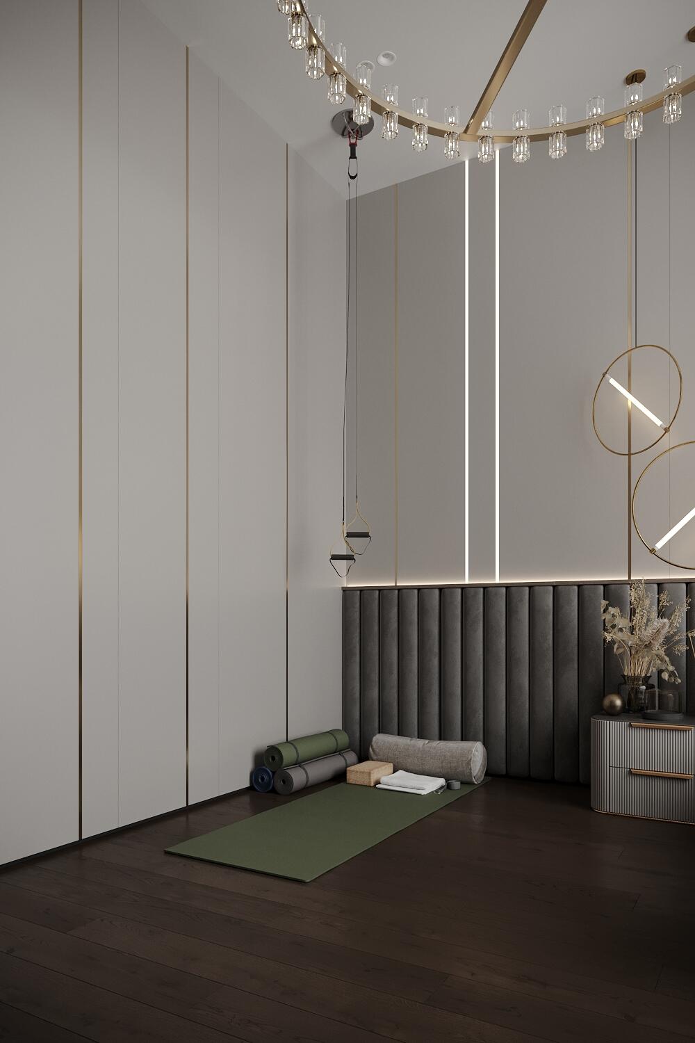 Интерьер выдержан в современном стиле с архитектурной геометрией.