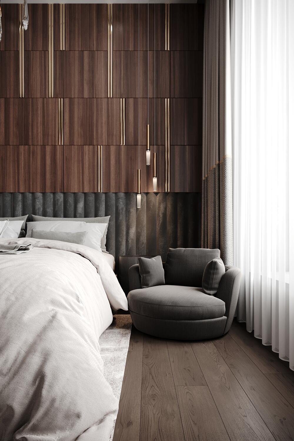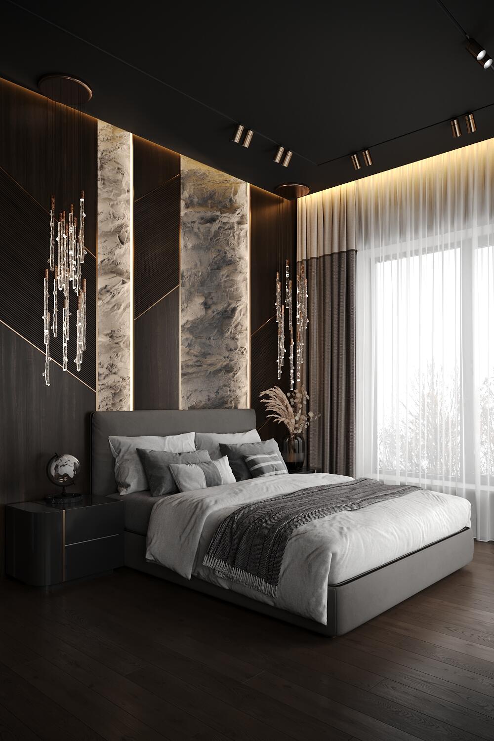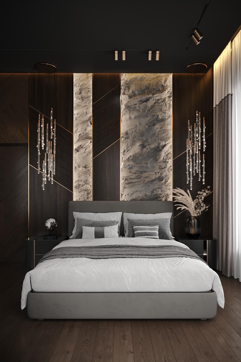 Интерьер дополнен изящными подвесными светильниками, которые создают мягкое, уютное освещение по обе стороны от кровати. У изножья располагается зона с ТВ, встроеная в декоративную панель из тёмного дерева и графитовых реек.