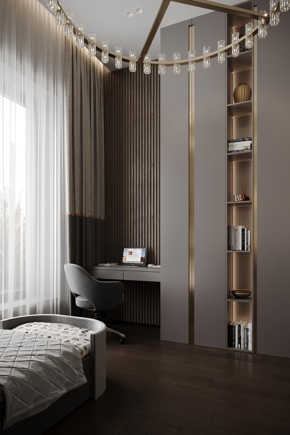 Гибкая, как график школьника. Пространство подстраивается под рост, интересы и количество игрушек. Акценты в виде крыльев на стене, рабочее место с интегрированным столом и зона с TRX — это вам не просто спальня, а стартовая площадка детских свершений.
